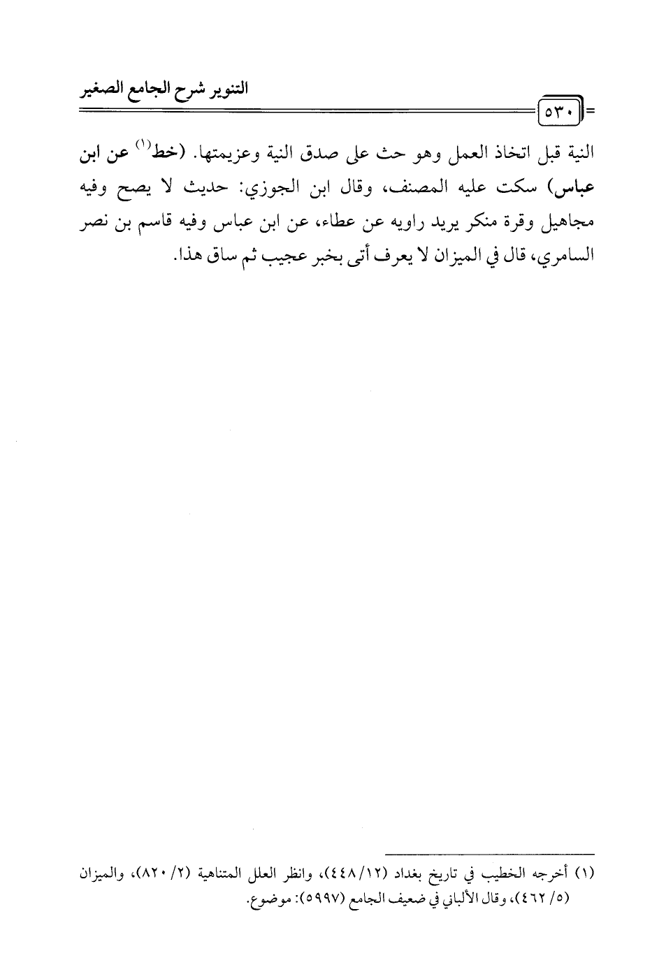 النية قبل اتخاذ العمل وهو حث على صدق النية وعزيمتها. (خط (¬1) عن ابن عباس) سكت عليه المصنف، وقال ابن الجوزي: حديث لا يصح وفيه مجاهيل وقرة منكر يريد راويه عن عطاء، عن ابن عباس وفيه قاسم بن نصر السامري، قال في الميزان لا يعرف أتى بخبر عجيب ثم ساق هذا.