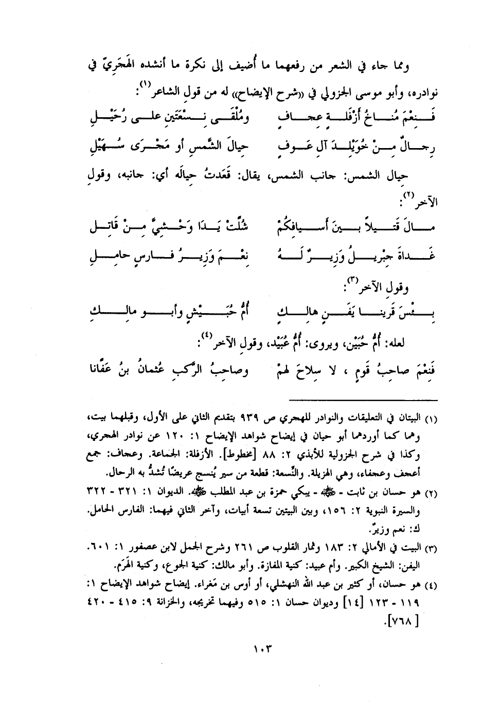 ومما جاء في الشعر من رفعهما ما أُضيف إلى نكرة ما أنشده الَهجَرِيّ في نوادره، وأبو موسى الجزولي في «شرح الإيضاح» له من قول الشاعر: