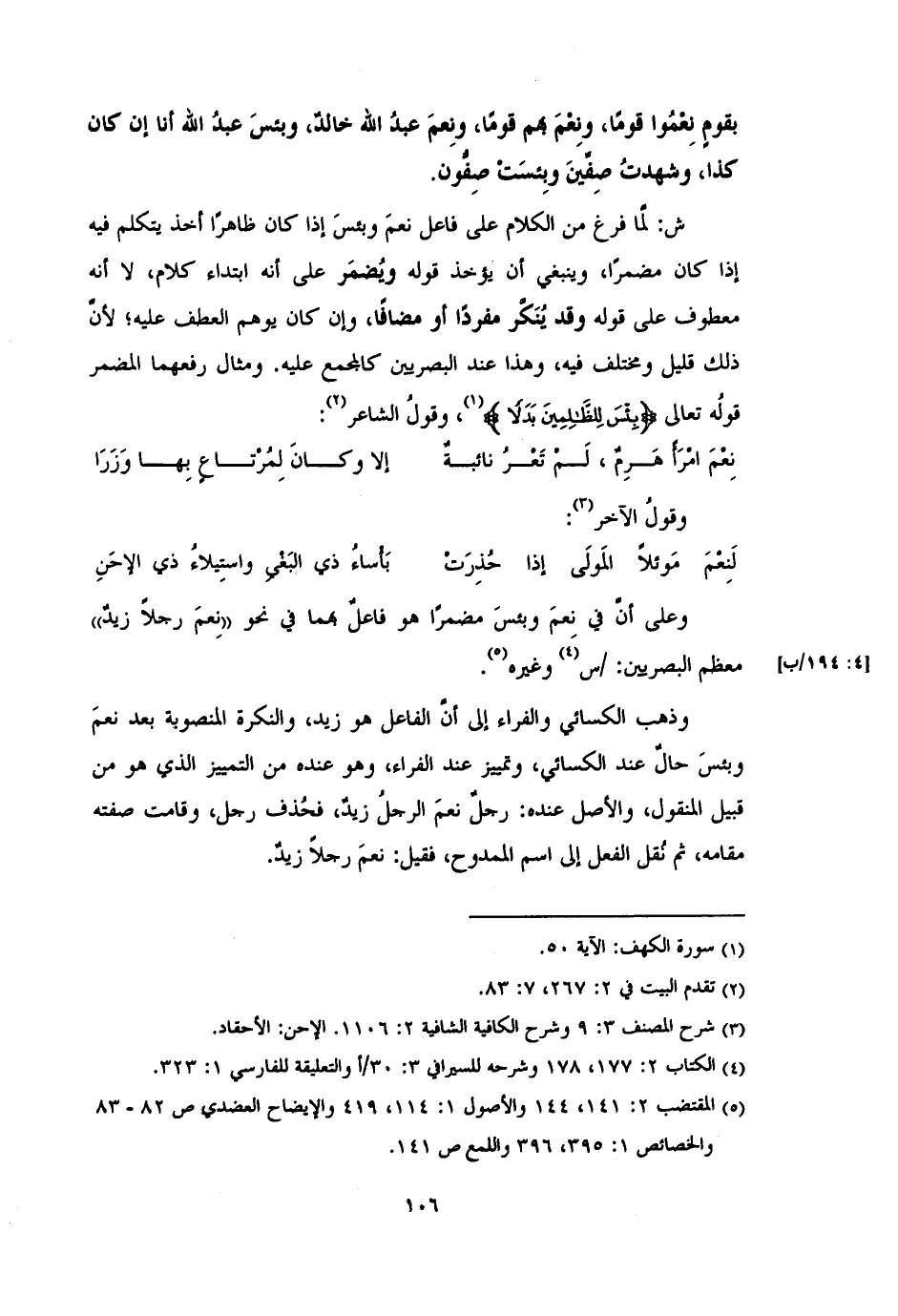 وعلى أنَّ في نِعمَ وبئسَ مضمرًا هو فاعلُ بهما في نحو «نِعمَ رجلاً زيدٌ» معظم البصريين: /س وغيره.