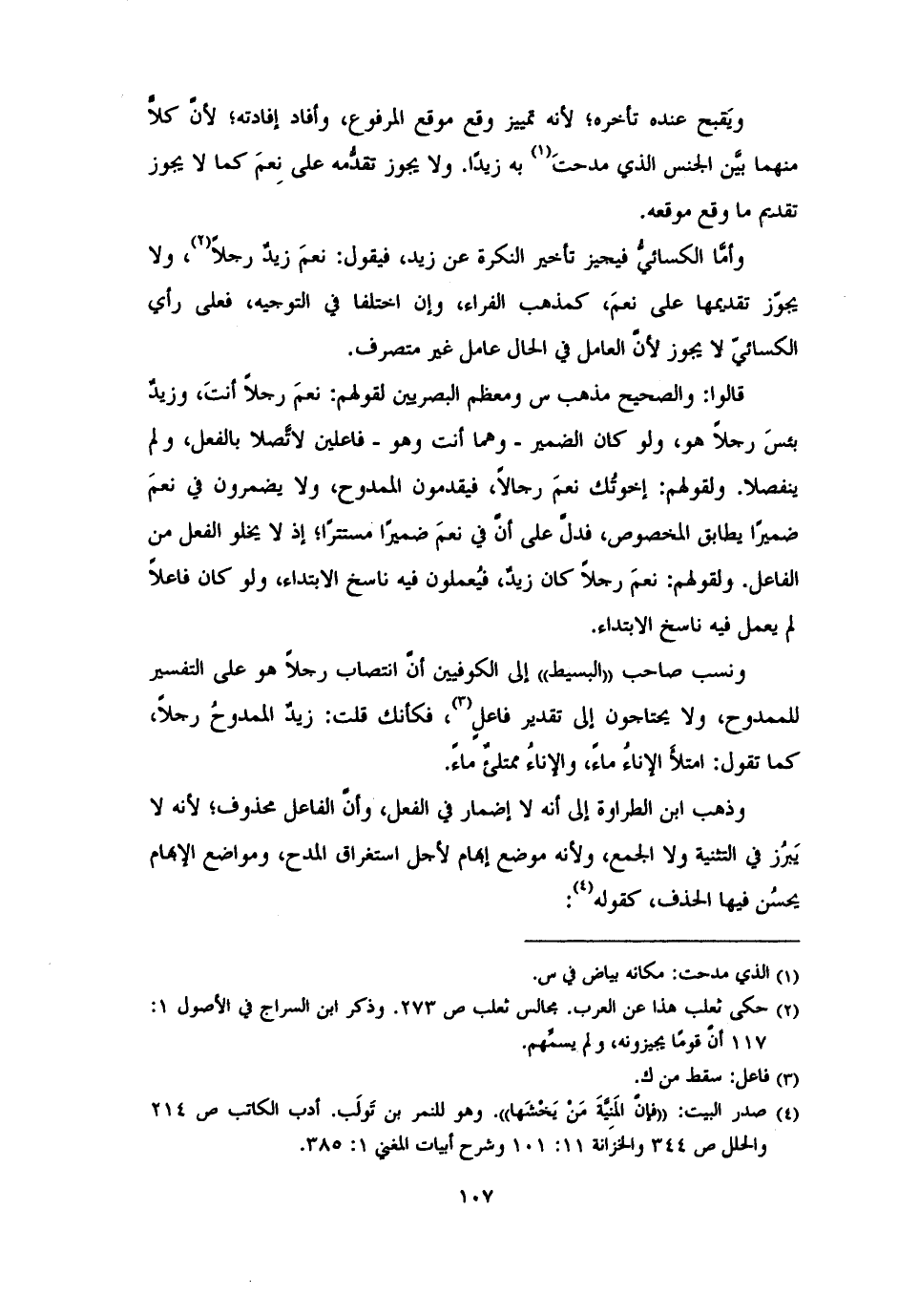 ونسب صاحب «البسيط» إلى الكوفيين أنَّ انتصاب رجلاً هو على التفسير للممدوح، ولا يحتاجون إلى تقدير فاعل، فكأنك قلت: زيدٌ الممدوحُ رجلاً، كما تقول: امتلاَ الإناءُ ماءً، والإناءُ ممتلئٌ ماءً.