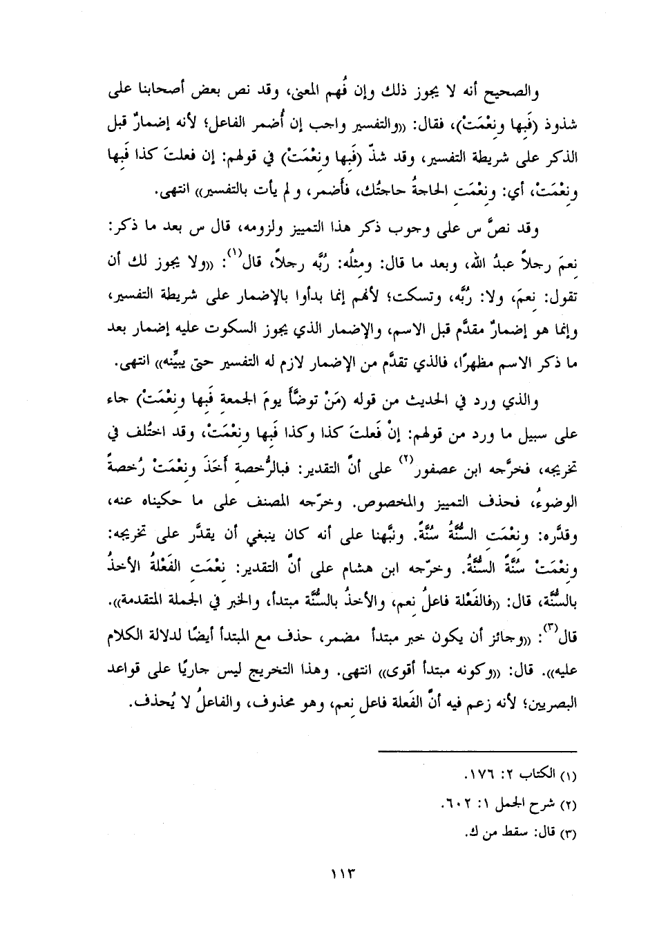 نِعمَ رجلاً عبد الله، وبعد ما قال: ومثلُه: رُبَّه رجلاً، قال: «ولا يجوز لك أن تقول: نِعمَ، ولا: رُبَّه، وتسكت؛ لأنهم إنما بدأوا بالإضمار على شريطة التفسير، وإنما هو إضمارُ مقدَّم قبل الاسم، والإضمار الذي يجوز السكوت عليه إضمار بعد ما ذكر الاسم مظهرًا، فالذي تقدَّم من الإضمار لازم له التفسير حتى يبيِّنه» انتهى.