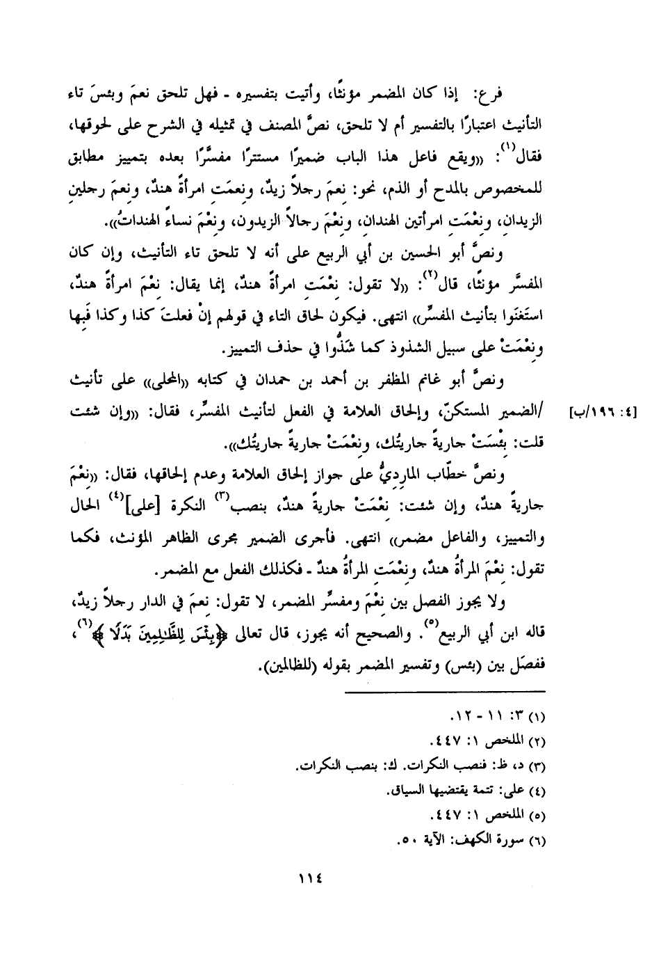 مؤنثًا، قال: «لا تقول: نِعْمَتِ امرأةً هندُ، إنما يقال: نِعْمَ امرأةً هندُ استَغنَوا