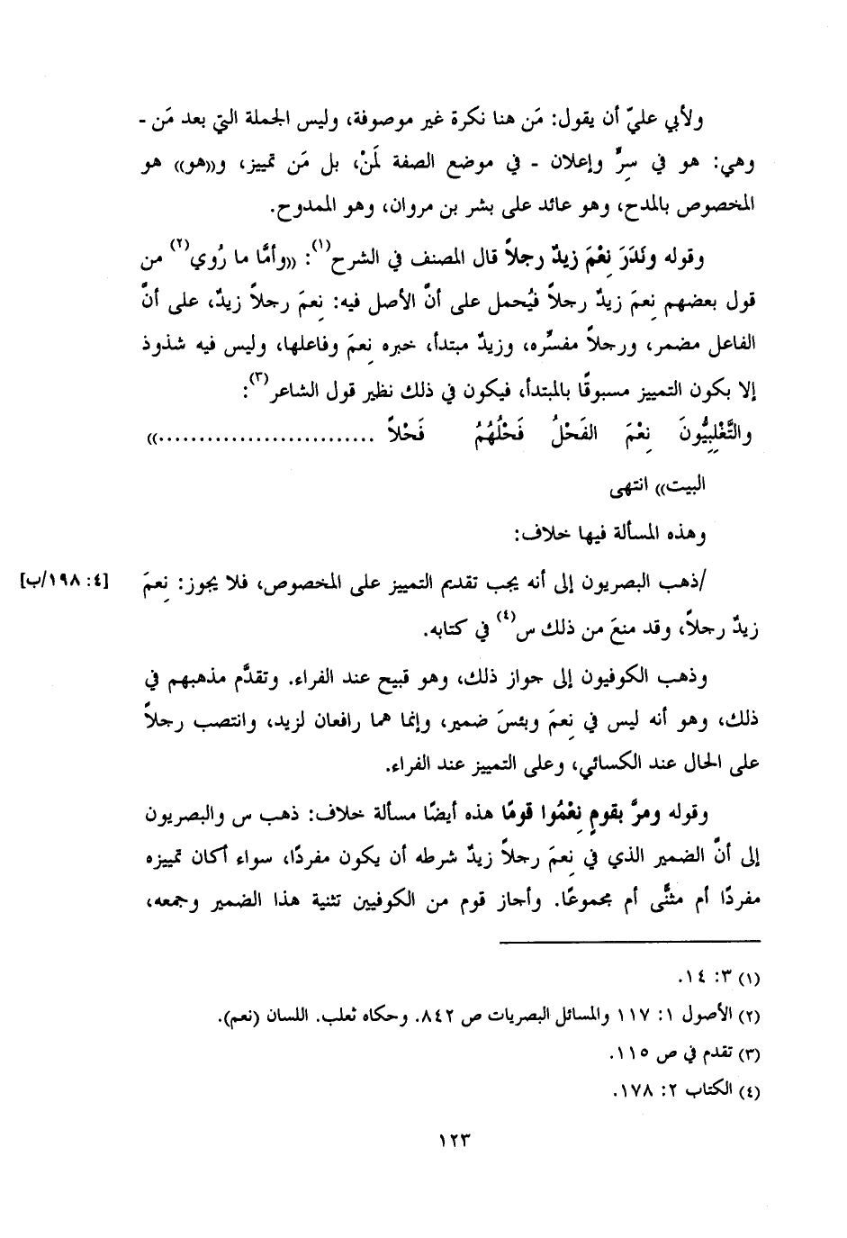 وقوله ومرَّ بقومٍ نِعْمُوا قومًا هذه أيضًا مسألة خلاف: ذهب س والبصريون إلى أنَّ الضمير الذي في نِعمَ رجلاً زيدُ شرطه أن يكون مفردًا، سواء أكان تمييزه مفردًا أم مثَّنى أم مجموعًا. وأجاز قوم من الكوفيين تثبية هذا الضمير وجمعه،