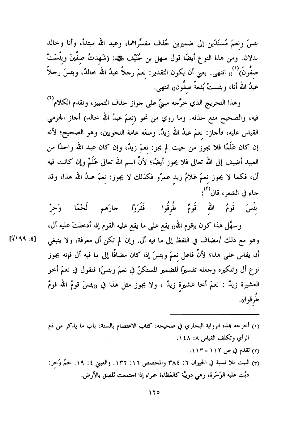 بئسَ ونِعمَ مُسنَدَين إلى ضميرين حُذف مفسراهما، وعبد الله مبتدأ، وأنا وخالد بدلان. ومن هذا النوع أيضًا قول سهل بن حُنيَف - رضي الله عنه -: (شَهدتُ صِفِّين وبئسَتْ صفُّونَ)» انتهى. يعني أن يكون التقدير: نِعمَ رجلاً عبدُ الله خالدُ، وبئسَ رجلاً عبدُ الله أنا، وبئستْ بقعةً صفُّون» انتهى.