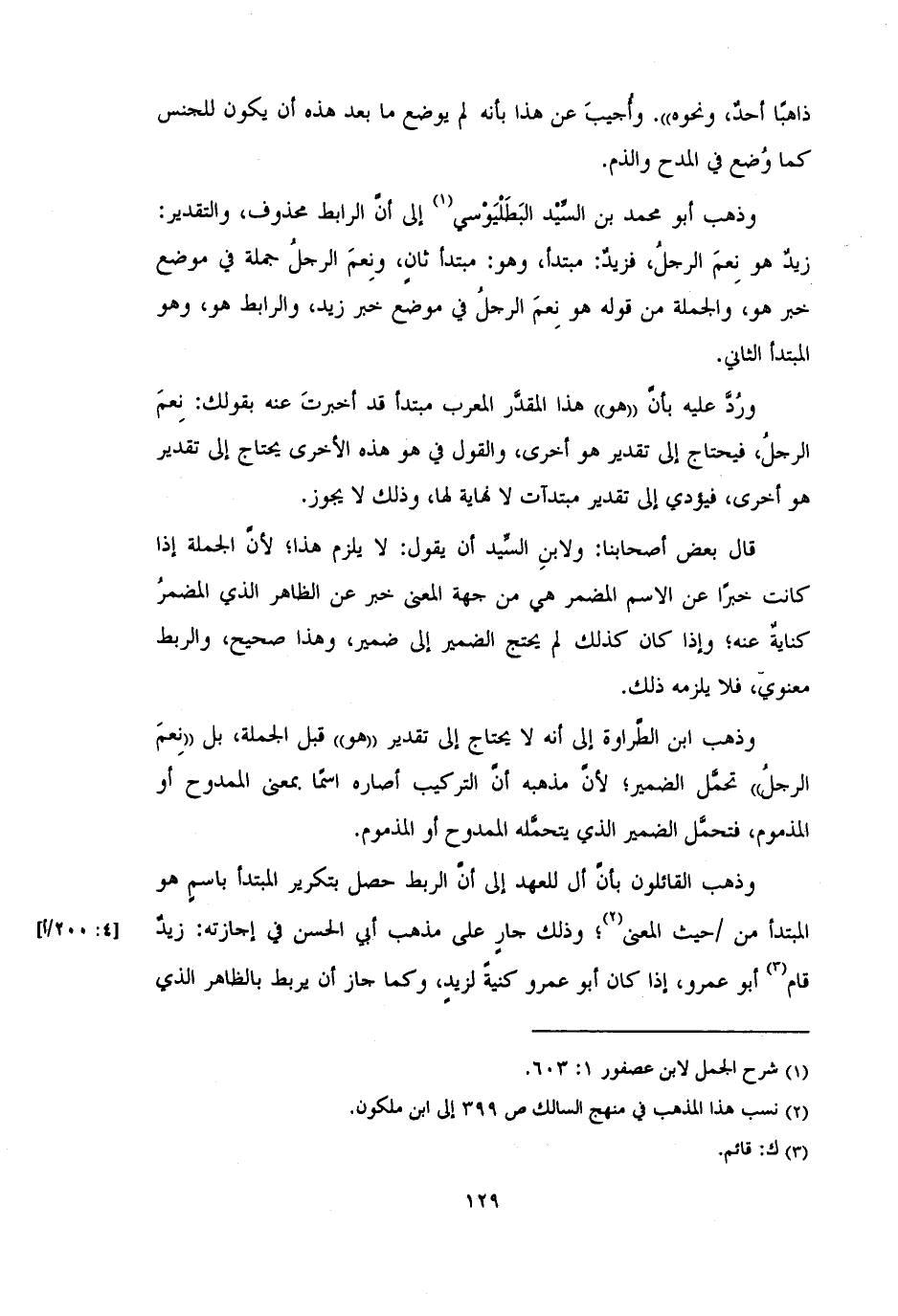 وذهب أبو محمد بن السيِّيْد البَطَلْيَوْسي إلى أنَّ الرابط محذوف، والتقدير: زيدُ هو نِعمَ الرجلُ، فزيدُ: مبتدأ، وهو: مبتدأ ثانٍ، ونِعمَ الرجلُ جملة في موضع خبر هو، والجملة من قوله هو نِعمَ الرجلُ في موضع خبر زيد، والرابط هو، وهو المبتدأ الثاني.