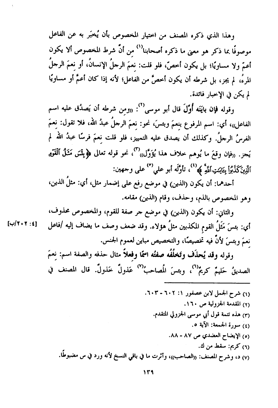 وهذا الذي ذكره المصنف من اختيار المخصوص بأن يُخبَر به عن الفاعل موصوفًا بما ذكر هو معنى ما ذكره أصحابنا مِن أنَّ شرط المخصوص ألا يكون أعمّ ولا مساويًا؛ بل يكون أخصّ، فلو قلت: نِعمَ الرجلُ الإنسانُ، أو نِعمَ الرجلُ المرء، لم يجز، بل شرطه أن يكون أخصَّ من الفاعل؛ لأنه إذا كان أعمَّ أو مساويًا