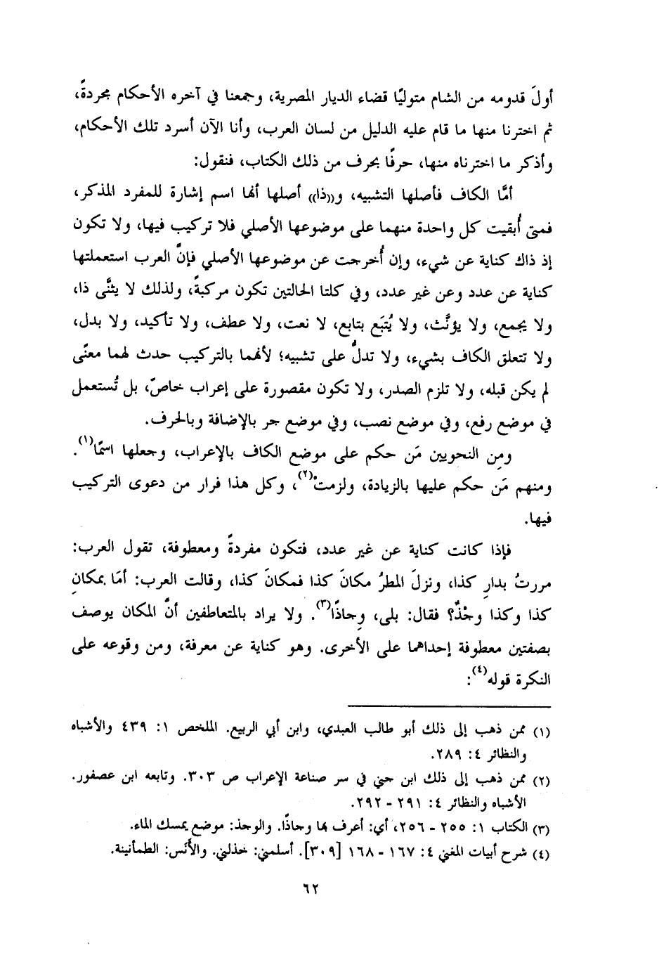 أمَّا الكاف فأصلها التشبيه، و «ذا» أصلها أنها اسم إشارة للمفرد المذكر، فمتى أُبقيت كل واحدة منهما على موضوعها الأصلي فلا تركيب فيها، ولا تكون إذ ذاك كناية عن شيء، وإن أُخرجت عن موضوعها الأصلي فإنَّ العرب استعملتها كناية عن عدد وعن غير عدد، وفي كلتا الحالتين تكون مركبةً، ولذلك لا يثنَّى ذا، ولا يجمع، ولا يؤنَّث، ولا يُتبَع بتابع، لا نعت، ولا عطف، ولا تأكيد، ولا بدل، ولا تتعلق الكاف بشيء، ولا ًتدلُّ على تشبيه؛ لأنهما بالتركيب حدث لهما معنًى لم يكن قبله، ولا تلزم الصدر، ولا تكون مقصورة على إعراب خاصّ، بل تُستعمل في موضع رفع، وفي موضع نصب، وفي موضع جر بالإضافة وبالحرف.