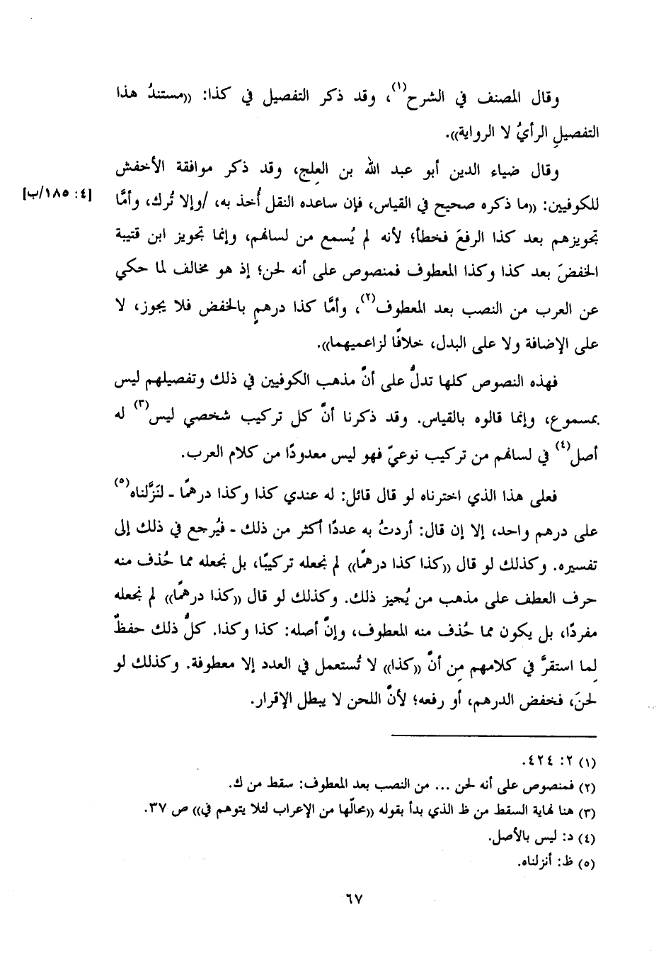وقال ضياء الدين أبو عبد الله بن العلج، وقد ذكر موافقة الأخفش للكوفيين: «ما ذكره صحيح في القياس، فإن ساعده النقل أخذ به، /وإلا تُرك، وأمََّا تجويزهم بعد كذا الرفعَ فخطأ؛ لأنه لم يُسمع من لسانهم، وإنما تجويز ابن قتيبة الخفضَ بعد كذا وكذا المعطوف فمنصوص على أنه لحن؛ إذ هو مخالف لما حكي عن العرب من النصب بعد المعطوف، وأمَّا كذا درهمٍ بالخفض فلا يجوز، لا على الإضافة ولا على البدل، خلافًا لزاعميهما».