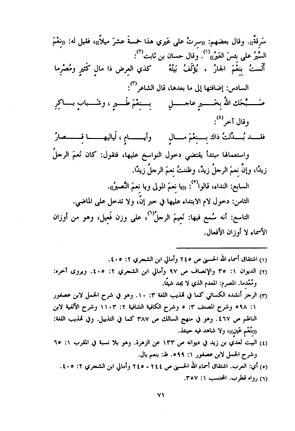 التاسع: أنه سُمع فيها: نَعِيمَ الرجلُ، على وزن فَعِيل، وهو من أوزان الأسماء لا أوزان الأفعال.
