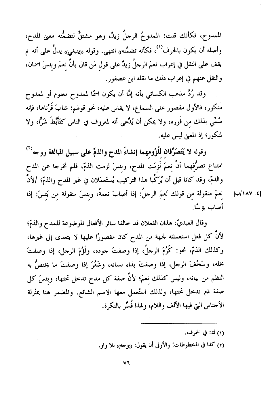 الممدوح، فكأنك قلت: الممدوحُ الرجلُ زيدٌ، وهو مشتقٌ لتضمُنه معنى المدح، وأصله أن يكون بالحرف، فكأنه تضمَّنه» انتهى. وقوله «ينبغي» يدلٌّ على أنه لم يقف على النقل في إعراب نعمَ الرجلُ زيدٌ على قولِ مَن قال بأن نِعمَ وبئسَ اسمان، والنقل عنهم في إعراب ذلك ما نقله ابن عصفور.