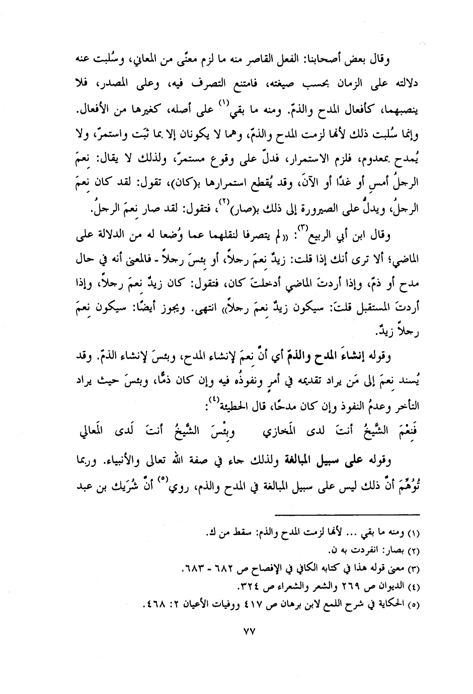 وقال بعض أصحابنا: الفعل القاصر منه لزم معنًى من المعاني، وسُلبت عنه دلالته على الزمان بحسب صيغته، فامتنع التصرف فيه، وعلى المصدر، فلا ينصبهما، كأفعال المدح والذمّ. ومنه ما بقي على أصله، كغيرها من الأفعال. وإنما سُلبت ذلك لأنها لزمت المدح والذمّ، وهما لا يكونان إلا بما ثَبت واستمرّ، ولا يُمدح بمعدوم، فلزم الاستمرار، فدلّ على وقوع مستمرّ، ولذلك لا يقال: نِعمَ الرجلُ أمس أو غدًا أو الآن، وقد يُقطع استمرارها بـ (كان)، تقول: لقد كان نِعمَ الرجلُ، ويدلُ على الصيرورة إلى ذلك بـ (صار)، فتقول: لقد صار نِعمَ الرجلُ.
