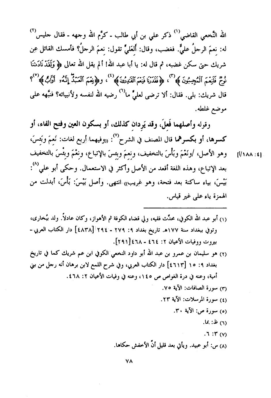 الله النَّخعي القاضي ذكر علي بن أبي طالب ــ كرَّم الله وجهه ــ فقال جليس له: نِعمَ الرجلُ عليُّ. فغضب، وقال: أَلعَليَّ تقول: نِعمّ الرجلُ؟ فأمسك القائل عن شريك حتى سكن غضبه، ثم قال له: يا أبا عبد الله! ألم يقل الله تعالى (ولقد نادانا نوح فلنعم المجيبون)، (فقدرنا فنعم القدرون)، (نعم العبد إنه أواب)؟ قال شريك: بلى. فقال: ألا ترضى لعليٍّ ما رضيه الله لنفسه ولأنبيائه؟ فنَّبهه على موضع غلطه.