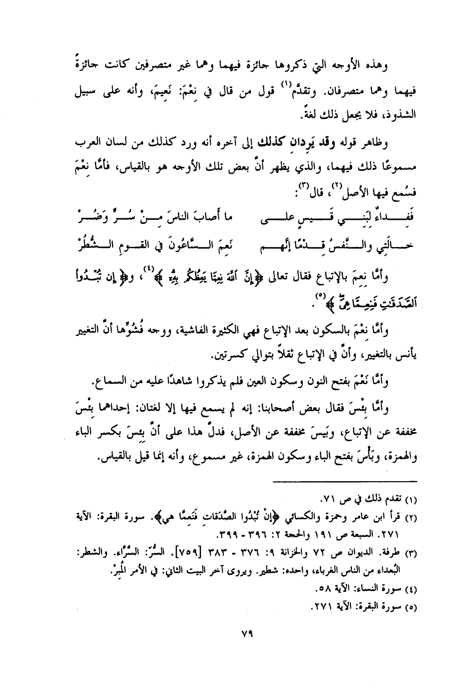 وأمَّا نِعْمَ بالسكون بعد الإتباع فهي الكثيرة الفاشية، ووجه فشُوها أنَّ التغيير يأنس بالتغيير، وأنّ في الإتباع ثقلاً بتوالي كسرتين.
