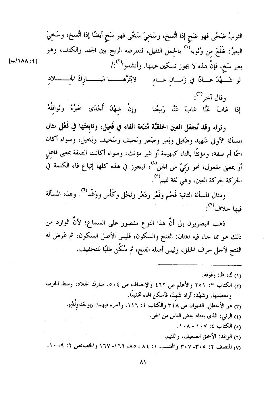وقوله (وقد تُجعَل العين الحلقيَّة متُبَعة الفاء في فَعيِل، وتابِعتَها في فَعْل) مثال المسألة الأولى شَهيد وضَئيل وبَعير وصَغير ونَحيف وسَخيف وبَخيل، وسواء أكان اسمًا أم صفة، ومؤنثًا بالتاء كبهيمة أو غير مؤنث، وسواء أكانت الصفة بمعنى فاعِلٍ أو بمعنى مفعول، نحو رَئيّ من الجن،
