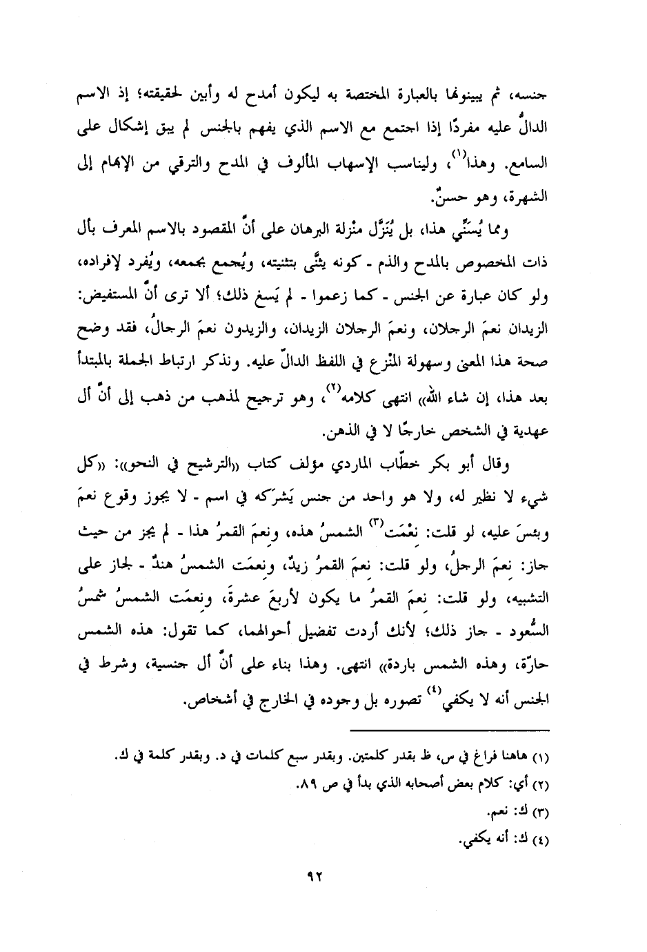وقال أبوبكر خطّاب الماردي مؤلف كتاب «الترشيح في النحو»:)) كل شيء لا نظير له، ولا هو واحد من جنس يَشرَكه في اسم ــ لا يجوز وقوع نعمَ وبئسَ عليه، لو قلت: نِعْمَت الشمسُ هذه، ونِعمَ القمر هذا ــ لم يجز من حيث جاز: نِعمَ الرجلُ، ولو قلت: نِعمَ القمرُ زيدٌ، ونِعمَت الشمسُ هندٌ، ــ لجاز على التشبيه، ولو قلت: نِعمَ القمرُ ما يكون لأربعَ عشرةَ، ونِعمَت الشمسُ شمسُ السُّعود ــ جاز ذلك؛ لأنك أردت تفضل أحوالهما، كما تقول: هذه الشمس حارّة، وهذه الشمس باردة» انتهى. وهذا بناء على أنَّ أل جنسية، وشرط في الجنس أنه لا يكفي تصوره بل وجوده في الخارج في أشخاص.