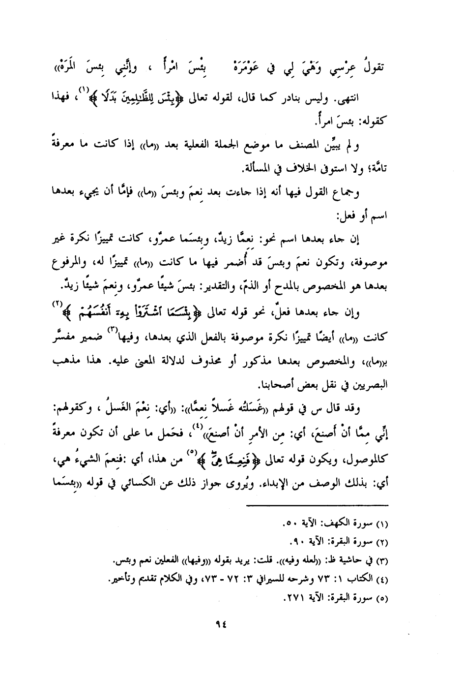 وقد قال س في قولهم «غَسَلتُه غَسلاً نِعِمَّا»: «أي: نِعْمَ الغَسلُ، وكقولهم: إني ممَّا أنْ أَصنعَ، أي: مِن الأمرِ أنْ أصنعَ»، فحَمل ما على أن تكون معرفةً كالموصول، ويكون قوله تعالى {فنعما هىَ} من هذا، أي: فِنعمَ الشيءُ هي،
