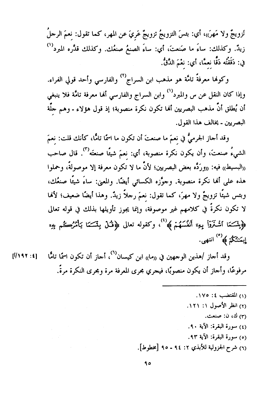 وقد أجاز الجرميُّ في نِعمَ ما صنعتَ أن تكون ما اسمًا تامَّا، كأنك قلت: نِعمَ الشيءُ صنعتَ، وأن يكون نكرة منصوبة، أي: نِعمَ شيئًا صنعتَه. قال صاحب «البسيط» فيه: «ورَدَّه بعض البصريين؛ لأنَّ ما لا تكون معرفة إلا موصولةً، وحملوا هذه على أنها نكرة منصوبة. وجوزه الكسائي أيضًا. والمعنى: ساءَ شيئًا صنعُك، وبئس شيئًا تزويجُ ولا مهرَ، كما تقول: نِعمَ رجلاً زيدٌ. وهذا أيضًا ضعيف؛ لأنها لا تكون نكرةً في كلامهم غير موصوفة، وإنما يجوز تأويلها بذلك في قوله تعالى