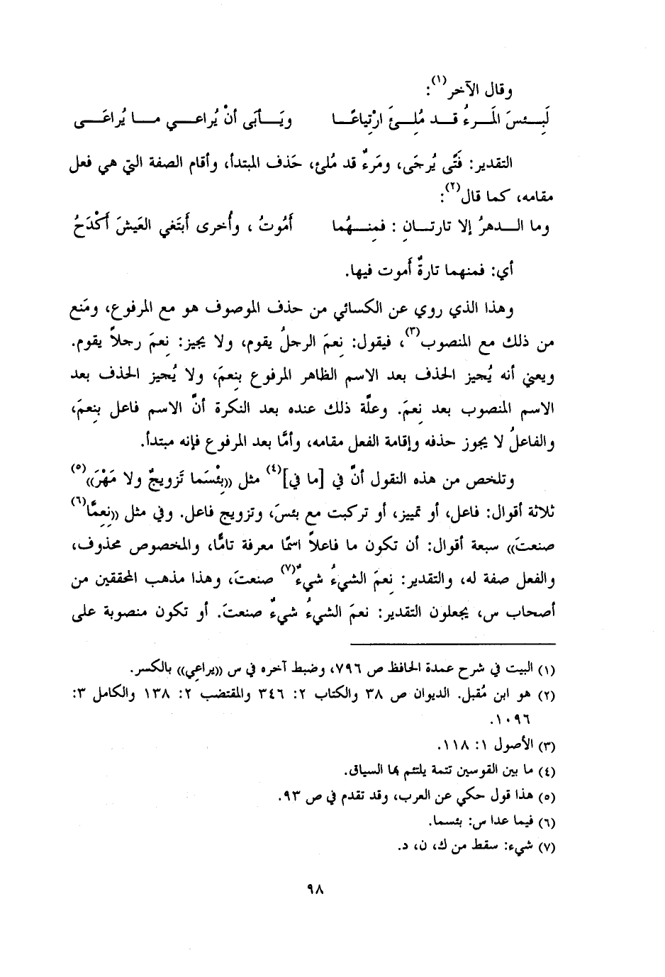 ويعني أنه يُجيز الحذف بعد الاسم الظاهر المرفوع بِنعمَ، ولا يُجيز الحذف بعد الاسم المنصوب بعد نِعمَ. وعلَّة ذلك عنده بعد النكرة أنَّ الاسم فاعل بنِعمَ، والفاعلُ لا يجوز حذفه وإقامة الفعل مقامه، وأمَّا بعد المرفوع فإنه مبتدأ.