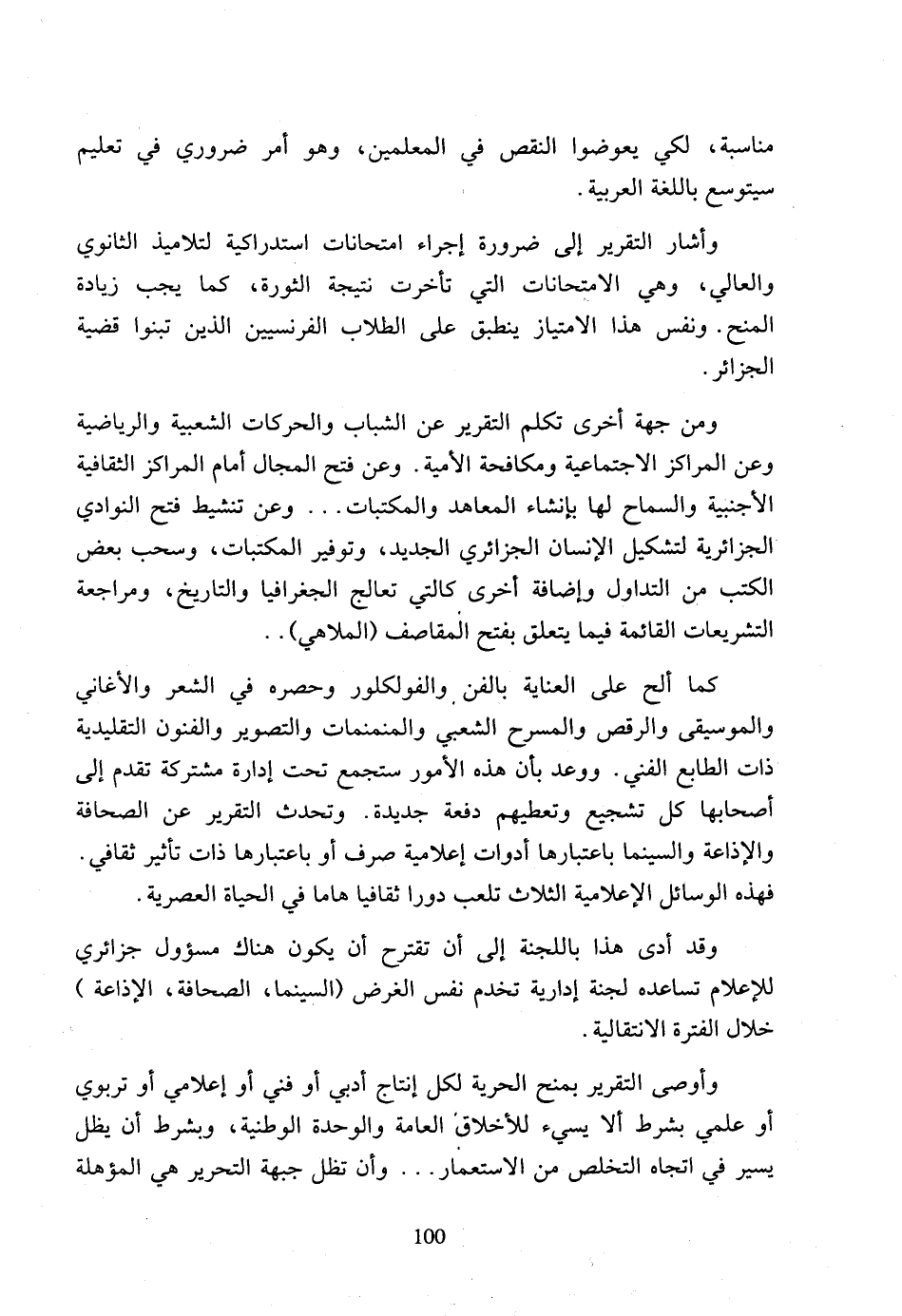 وأوصى التقرير بمنح الحرية لكل إنتاج أدبي أو فني أو إعلامي أو تربوي أو علمي بشرط ألا يسيء للأخلاق العامة والوحدة الوطنية، وبشرط أن يظل يسير في اتجاه التخلص من الاستعمار ... وأن تظل جبهة التحرير هي المؤهلة