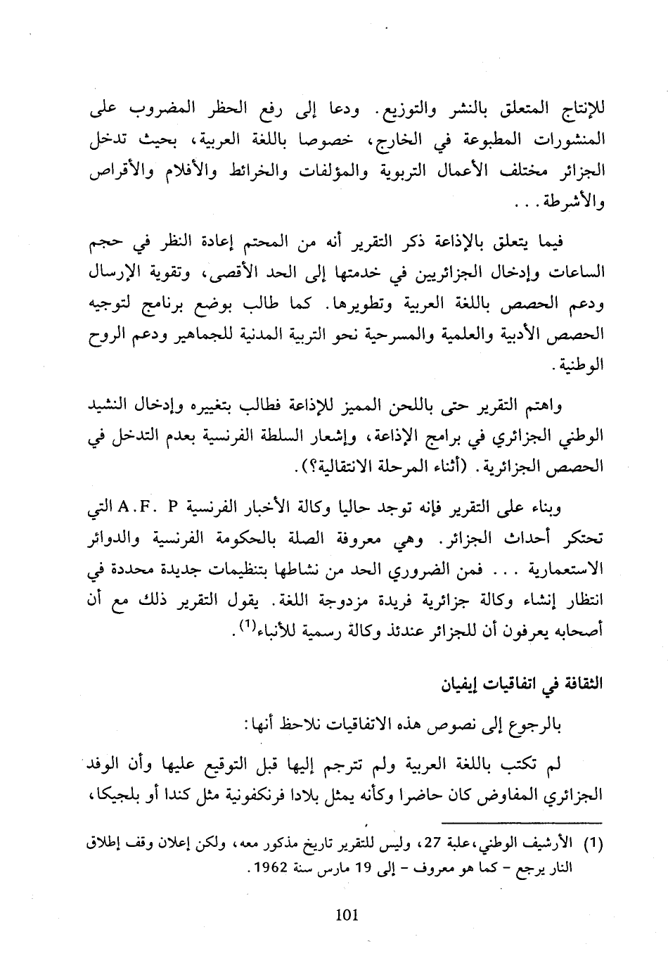 (1) الأرشيف الوطني، علبة 27، وليس للتقرير تاريخ مذكور معه، ولكن إعلان وقف إطلاق النار يرجع - كما هو معروف - إلى 19 مارس سنة 1962.
