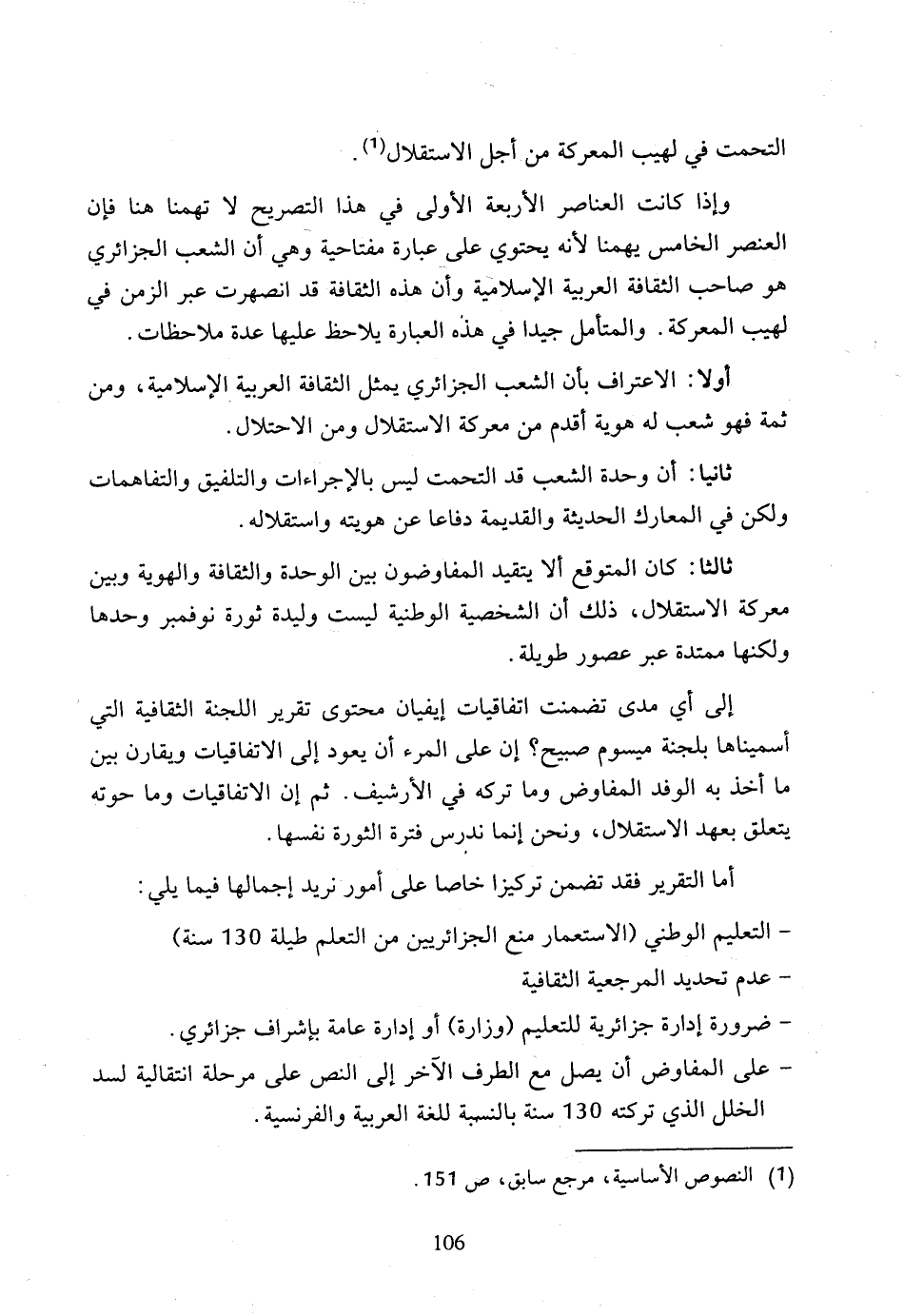 ثالثا: كان المتوقع ألا يتقيد المفاوضون بين الوحدة والثقافة والهوية وبين معركة الاستقلال، ذلك أن الشخصية الوطنية ليست وليدة ثورة نوفمبر وحدها ولكنها ممتدة عبر عصور طويلة.
