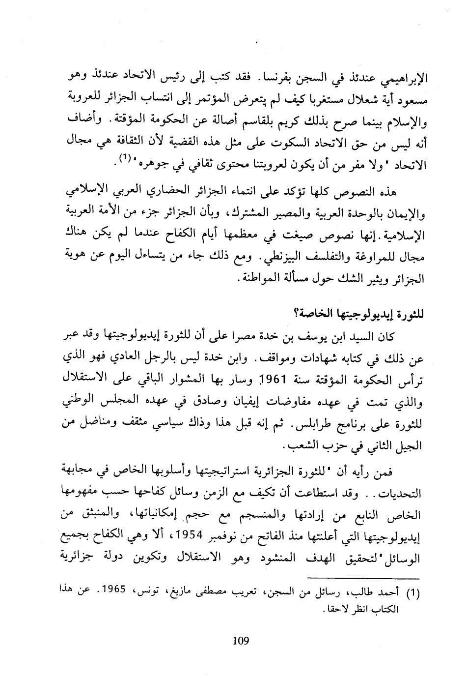 كان السيد ابن يوسف بن خدة مصرا على أن للثورة إيديولوجيتها وقد عبر عن ذلك في كتابه شهادات ومواقف، وابن خدة ليس بالرجل العادي فهو الذي ترأس الحكومة المؤقتة سنة 1961 وسار بها المشوار الباقي على الاستقلال والذي تمت في عهده مفاوضات إيفيان وصادق في عهده المجلس الوطني للثورة على برنامج طرابلس، ثم إنه قبل هذا وذاك سياسي مثقف ومناضل من الجيل الثاني في حزب الشعب.