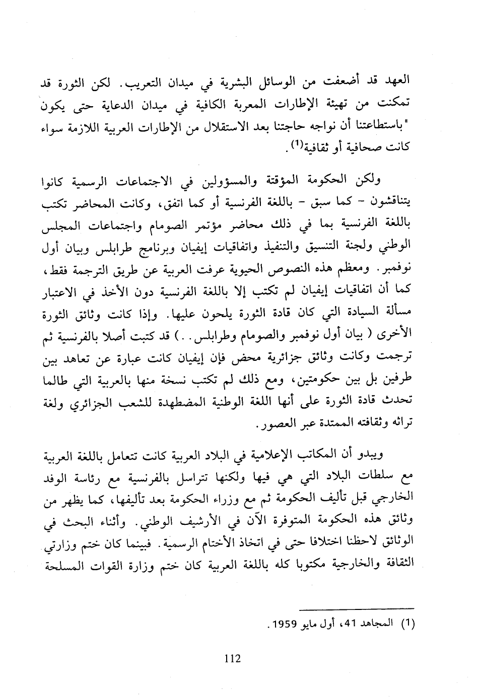 ولكن الحكومة المؤقتة والمسؤولين في الاجتماعات الرسمية كانوا يتناقشون - كما سبق - باللغة الفرنسية أو كما اتفق، وكانت المحاضر تكتب باللغة الفرنسية بما في ذلك محاضر مؤتمر الصومام واجتماعات المجلس الوطني ولجنة التنسيق والتنفيذ واتفاقيات إيفيان وبرنامج طرابلس وبيان أول نوفمبر، ومعظم هذه النصوص الحيوية عرفت العربية عن طريق الترجمة فقط، كما أن اتفاقيات إيفيان لم تكتب إلا باللغة الفرنسية دون الأخذ في الاعتبار مسألة السيادة التي كان قادة الثورة يلحون عليها، وإذا كانت وثائق الثورة الأخرى (بيان أول نوفمبر والصومام وطرابلس ..) قد كتبت أصلا بالفرنسية ثم ترجمت وكانت وثائق جزائرية محض فإن إيفيان كانت عبارة عن تعاهد بين طرفين بل بين حكومتين، ومع ذلك لم تكتب نسخة منها بالعربية التي طالما تحدث قادة الثورة على أنها اللغة الوطنية المضطهدة للشعب الجزائري ولغة تراثه وثقافته الممتدة عبر العصور.