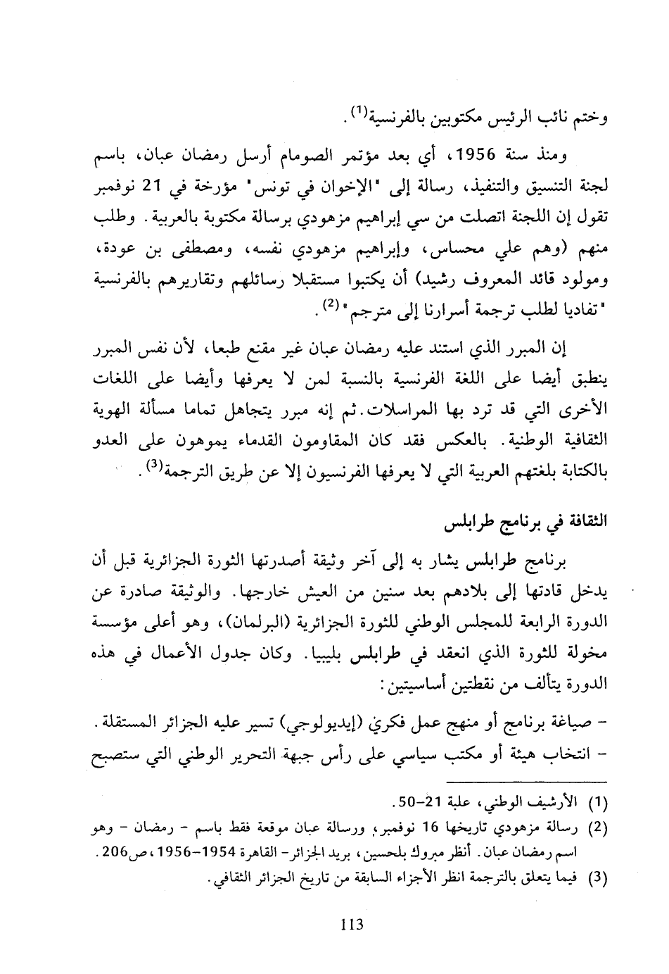 إن المبرر الذي استند عليه رمضان عبان غير مقنع طبعا، لأن نفس المبرر ينطبق أيضا على اللغة الفرنسية بالنسبة لمن لا يعرفها وأيضا على اللغات الأخرى التي قد ترد بها المراسلات، ثم إنه مبرر يتجاهل تماما مسألة الهوية الثقافية الوطنية، بالعكس فقد كان المقاومون القدماء يموهون على العدو بالكتابة بلغتهم العربية التي لا يعرفها الفرنسيون إلا عن طريق الترجمة (3).