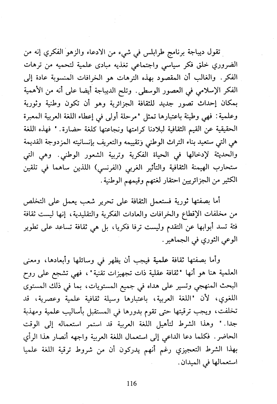 تقول ديباجة برنامج طرابلس في شيء من الادعاء والزهو الفكري إنه من الضروري خلق فكر سياسي واجتماعي تغذيه مبادى علمية لتحميه من ترهات الفكر، والغالب أن المقصود بهذه الترهات هو الخرافات المنسوبة عادة إلى الفكر الإسلامي في العصور الوسطى، وتلح الديباجة أيضا على أنه من الأهمية بمكان إحداث تصور جديد للثقافة الجزائرية وهو أن تكون وطنية وثورية وعلمية: فهي وطينة باعتبارها تمثل (مرحلة أولى في إعطاء اللغة العربية المعبرة الحقيقية عن القيم الثقافية لبلادنا كرامتها ونجاعتها كلغة حضارة،) فهذه اللغة هي التي ستعيد بناء التراث الوطني وتقييمه والتعريف بإنسانيته المزدوجة القديمة والحديثة لإدخالها في الحياة الفكرية وتربية الشعور الوطني، وهي التي ستحارب الهيمنة الثقافية والتأثير الغربي (الفرنسي) اللذين ساهما في تلقين الكثير من الجزائريين احتقار لغتهم وقيمهم الوطنية.