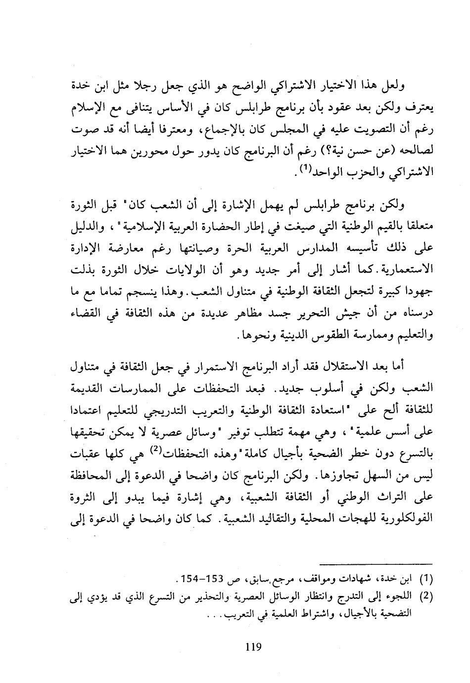 ولعل هذا الاختيار الاشتراكي الواضح هو الذي جعل رجلا مثل ابن خدة يعترف ولكن بعد عقود بأن برنامج طرابلس كان في الأساس يتنافى مع الإسلام رغم أن التصويت عليه في المجلس كان بالإجماع، ومعترفا أيضا أنه قد صوت لصالحه (عن حسن نية؟) رغم أن البرنامج كان يدور حول محورين هما الاختيار الاشتراكي والحزب الواحد (1).