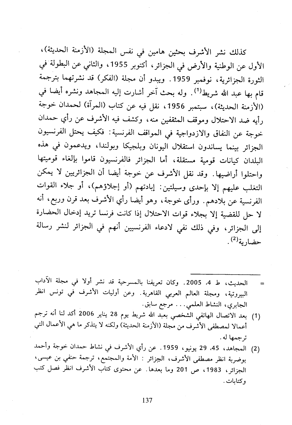 (2) المجاهد، 45، 29 يونيو، 1959، عن رأي الأشرف في نشاط حمدان خوجة وأحمد بوضربة انظر مصطفى الأشرف، الجزائر: الأمة والمجتمع، ترجمة حنفي بن عيسى، الجزائر، 1983، ص 201 وما بعدها، عن محتوى كتاب الأشرف انظر فصل كتب وكتابات.