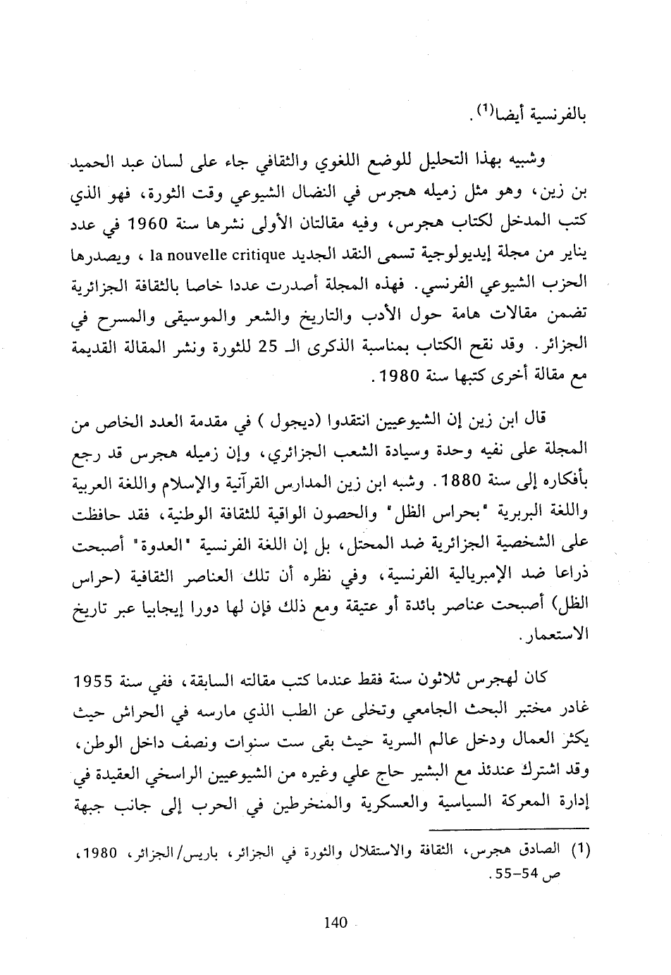 (1) الصادق هجرس، الثقافة والاستقلال والثورة في الجزائر، باريس/ الجزائر، 1980، ص 54 - 55.