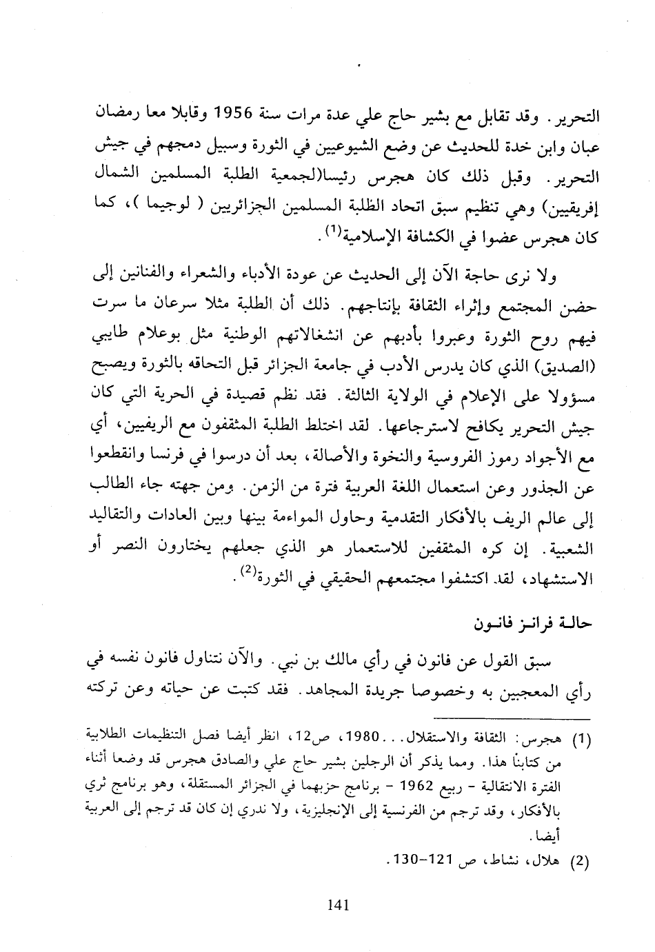 (1) هجرس: الثقافة والاستقلال ... 1980، ص 12، انظر أيضا فصل التنظيمات الطلابية من كتابنا هذا، ومما يذكر أن الرجلين بشير حاج علي والصادق هجرس قد وضعا أثناء الفترة الانتقالية - ربيع 1962 - برنامج حزبهما في الجزائر المستقلة، وهو برنامج ثري بالأفكار، وقد ترجم من الفرنسية إلى الإنجليزية، ولا ندري إن كان قد ترجم إلى العربية أيضا.