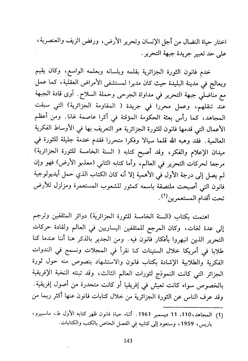 (1) المجاهد، 110، 11 ديسمبر 1961، أثناء حياة فانون ظهر كتابه الأول ط، ماسبيرو، باريس، 1959، وسنعود إلى كتابيه في الفصل الخاص بالكتب والكتابات.