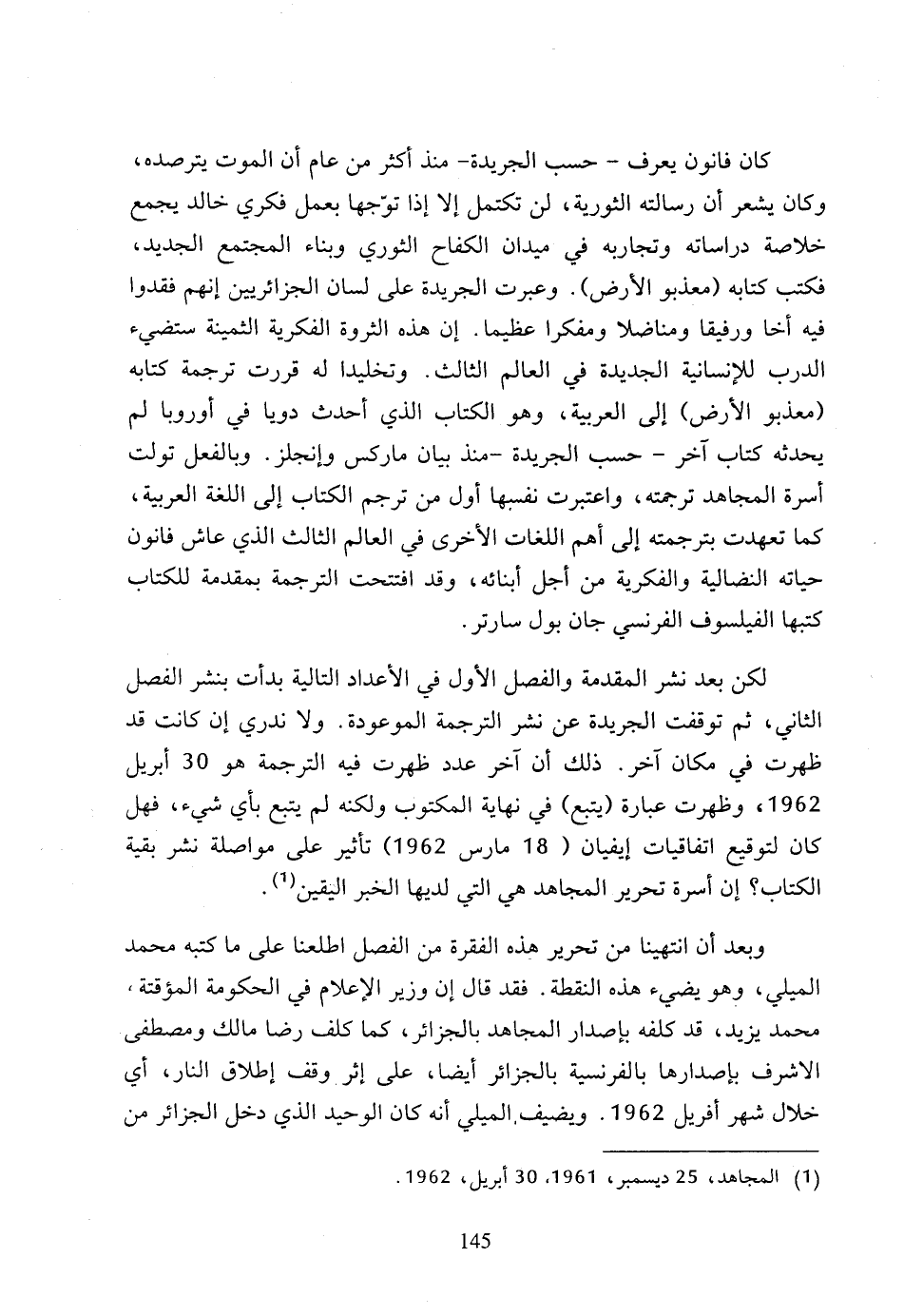 لكن بعد نشر المقدمة والفصل الأول في الأعداد التالية بدأت بنشر الفصل الثاني، ثم توقفت الجريدة عن نشر الترجمة الموعودة، ولا ندري إن كانت قد ظهرت في مكان آخر، ذلك أن آخر عدد ظهرت فيه الترجمة هو 30 أبريل 1962، وظهرت عبارة (يتبع) في نهاية المكتوب ولكنه لم يتبع بأي شيء، فهل كان لتوقيع اتفاقيات إيفيان (18 مارس 1962) تأثير على مواصلة نشر بقية الكتاب؟ إن أسرة تحرير المجاهد هي التي لديها الخبر اليقين (1).