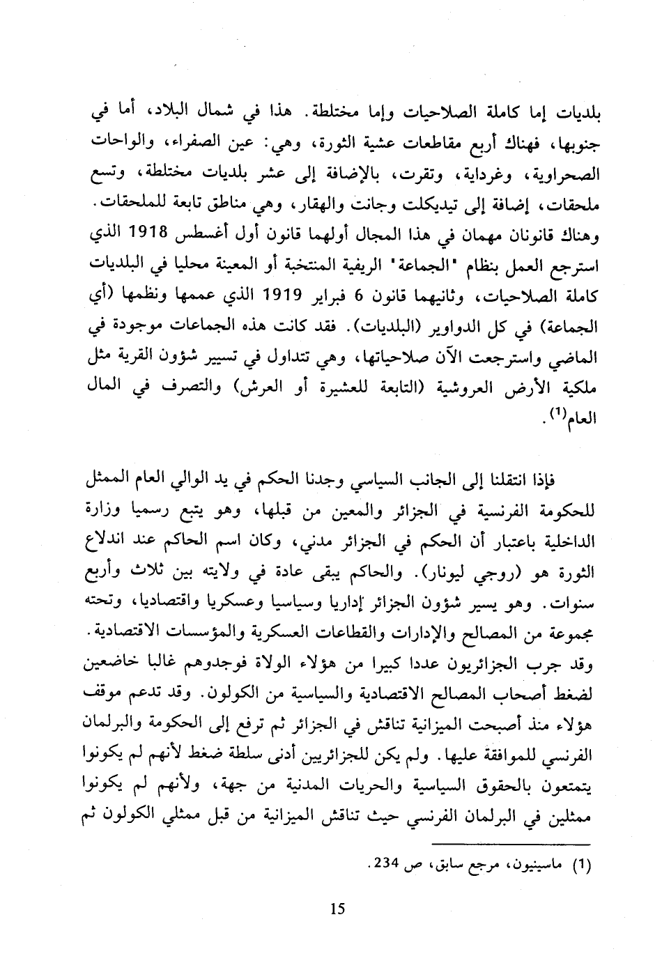 بلديات إما كاملة الصلاحيات وإما مختلطة، هذا في شمال البلاد، أما في جنوبها، فهناك أربع مقاطعات عشية الثورة، وهي: عين الصفراء، والواحات الصحراوية، وغرداية، وتقرت، بالإضافة إلى عشر بلديات مختلطة، وتسع ملحقات، إضافة إلى تيديكلت وجانت والهقار، وهي مناطق تابعة للملحقات، وهناك قانونان مهمان في هذا المجال أولهما قارن أول أغسطس 1918 الذي استرجع العمل بنظام (الجماعة) الريفية المنتخبة أو المعينة محليا في البلديات كاملة الصلاحيات، وثانيهما قانون 6 فبراير 1919 الذي عممها ونظمها (أي الجماعة) في كل الدواوير (البلديات)، فقد كانت هذه الجماعات موجودة في الماضي واسترجعت الآن صلاحياتها، وهي تتداول في تسيير شؤون القرية مثل ملكية الأرض العروشية (التابة للعشيرة أو العرش) والتصرف في المال العام (1).