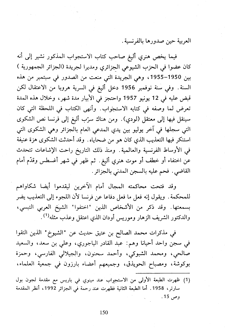 (1) ظهرت الطبعة الأولى من الاستجواب عند مينوي في باريس مع مقدمة لجون بول سارتر، 1958، أما الطبعة الثانية فظهرت عند رحمة في الجزائر 1992، أنظر المقدمة وص 15.