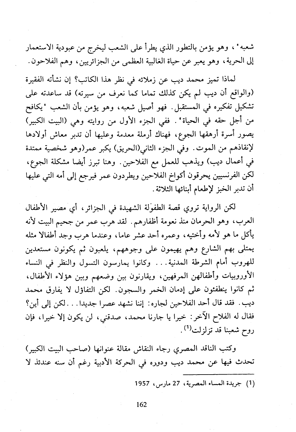 لماذا تميز محمد ديب عن زملائه في نظر هذا الكاتب؟ إن نشأته الفقيرة (والواقع أن ديب لم يكن كذلك تماما كما نعرف من سيرته) قد ساعدته على تشكيل تفكيره في المستقبل، فهو أصيل شعبه، وهو يؤمن بأن الشعب (يكافح من أجل حقه في الحياة، ففي الجزء الأول من روايته وهي (البيت الكبير) يصور أسرة أرهقها الجوع، فهناك أرملة معدمة وعليها أن تدبر معاش أولادها لإنقاذهم من الموت، وفي الجزء الثاني (الحريق) يكبر عمر (وهو شخصية ممتدة في أعمال ديب) ويذهب للعمل مع الفلاحين، وهنا تبرز أيضا مشكلة الجوع. لكن الفرنسيين يحرقون أكواخ الفلاحين ويطردون عمر فيرجع إلى أمه التي عليها أن تدبر الخبز لإطعام أبنائها الثلاثة.