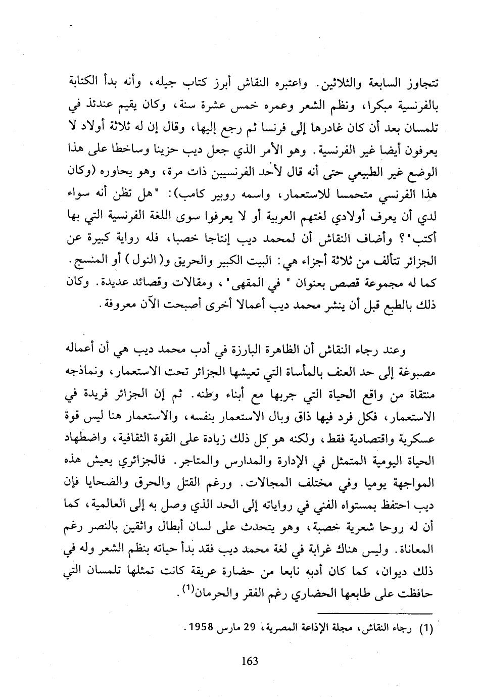 تتجاوز السابعة والثلاثين، واعتبره النقاش أبرز كتاب جيله، وأنه بدأ الكتابة بالفرنسية مبكرا، ونظم الشعر وعمره خمس عشرة سنة، وكان يقيم عندئذ في تلمسان بعد أن كان غادرها إلى فرنسا ثم رجع إليها، وقال إن له ثلاثة أولاد لا يعرفون أيضا غير الفرنسية، وهو الأمر الذي جعل ديب حزينا وساخطا على هذا الوضع غير الطبيعي حتى أنه قال لأحد الفرنسيين ذات مرة، وهو يحاوره (وكان هذا الفرنسي متحمسا للاستعمار، واسمه روبير كامب): (هل تظن أنه سواء لدي أن يعرف أولادي لغتهم العربية أو لا يعرفوا سوى اللغة الفرنسية التي بها أكتب؟ وأضاف النقاش أن لمحمد ديب إنتاجا خصبا، فله رواية كبيرة عن الجزائر تتألف من ثلاثة أجزاء هي: البيت الكبير والحريق و (النول) أو المنسج، كما له مجموعة قصص بعنوان (في المقهى)، ومقالات وقصائد عديدة، وكان ذلك بالطبع قبل أن ينشر محمد ديب أعمالا أخرى أصبحت الآن معروفة.