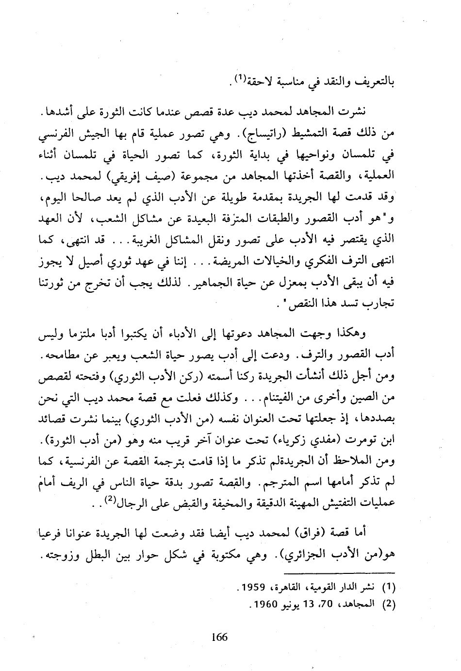 وهكذا وجهت المجاهد دعوتها إلى الأدباء أن يكتبوا أدبا ملتزما وليس أدب القصور والترف، ودعت إلى أدب يصور حياة الشعب ويعبر عن مطامحه، ومن أجل ذلك أنشأت الجريدة ركنا أسمته (ركن الأدب الثوري) وفتحته لقصص من الصين وأخرى من الفيتنام ... وكذلك فعلت مع قصة محمد ديب التي نحن بصددها، إذ جعلتها تحت العنوان نفسه (من الأدب الثوري) بينما نشرت قصائد ابن تومرت (مفدي زكرياء) تحت عنوان آخر قريب منه وهو (من أدب الثورة)، ومن الملاحظ أن الجريدة لم تذكر ما إذا قامت بترجمة القصة عن الفرنسية، كما لم تذكر أمامها اسم المترجم، والقصة تصور بدقة حياة الناس في الريف أمام عمليات التفتيش المهينة الدقيقة والمخيفة والقبض على الرجال (2) ..