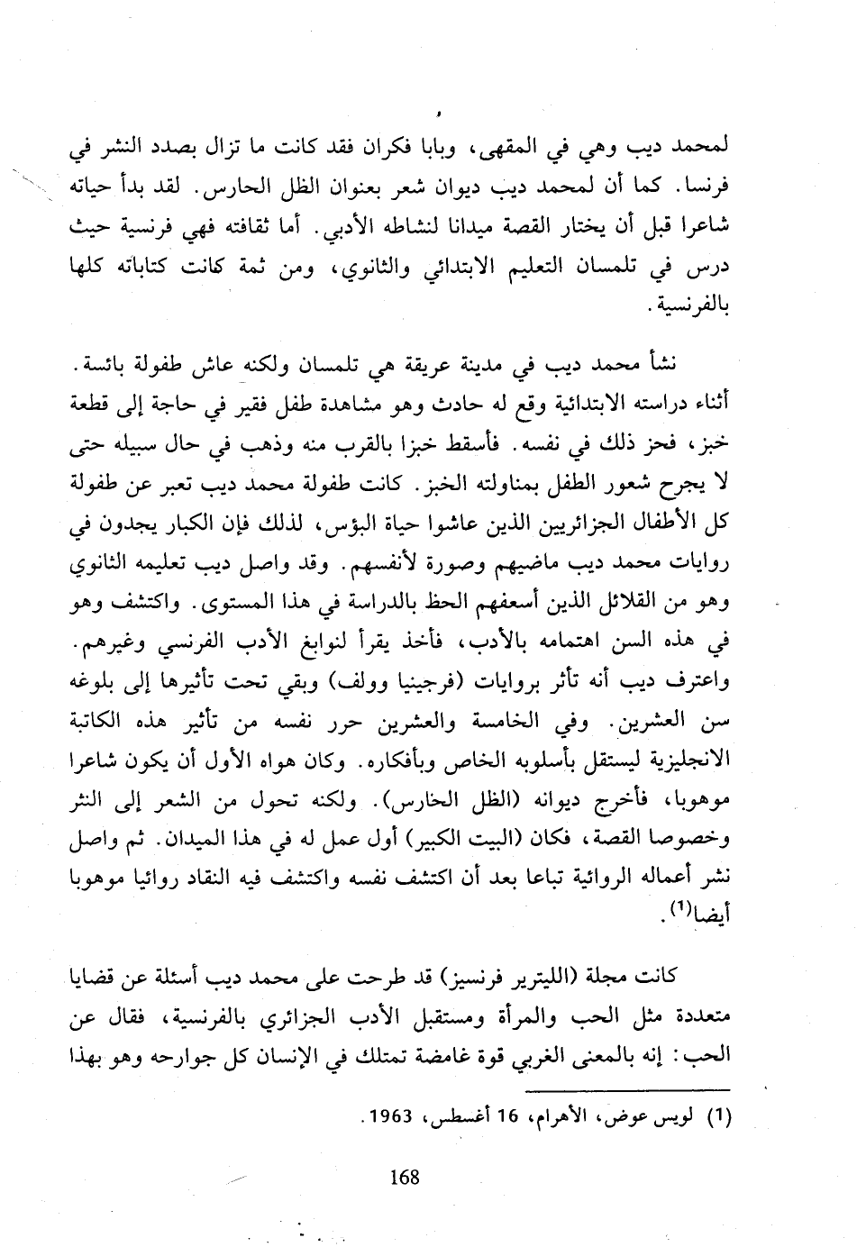 لمحمد ديب وهي في المقهى، وبابا فكران فقد كانت ما تزال بصدد النشر في فرنسا، كما أن لمحمد ديب ديوان شعر بعنوان الظل الحارس، لقد بدأ حياته شاعرا قبل أن يختار القصة ميدانا لنشاطه الأدبي، أما ثقافته فهي فرنسية حيث درس في تلمسان التعليم الابتدائي والثانوي، ومن ثمة كانت كتاباته كلها بالفرنسية.
