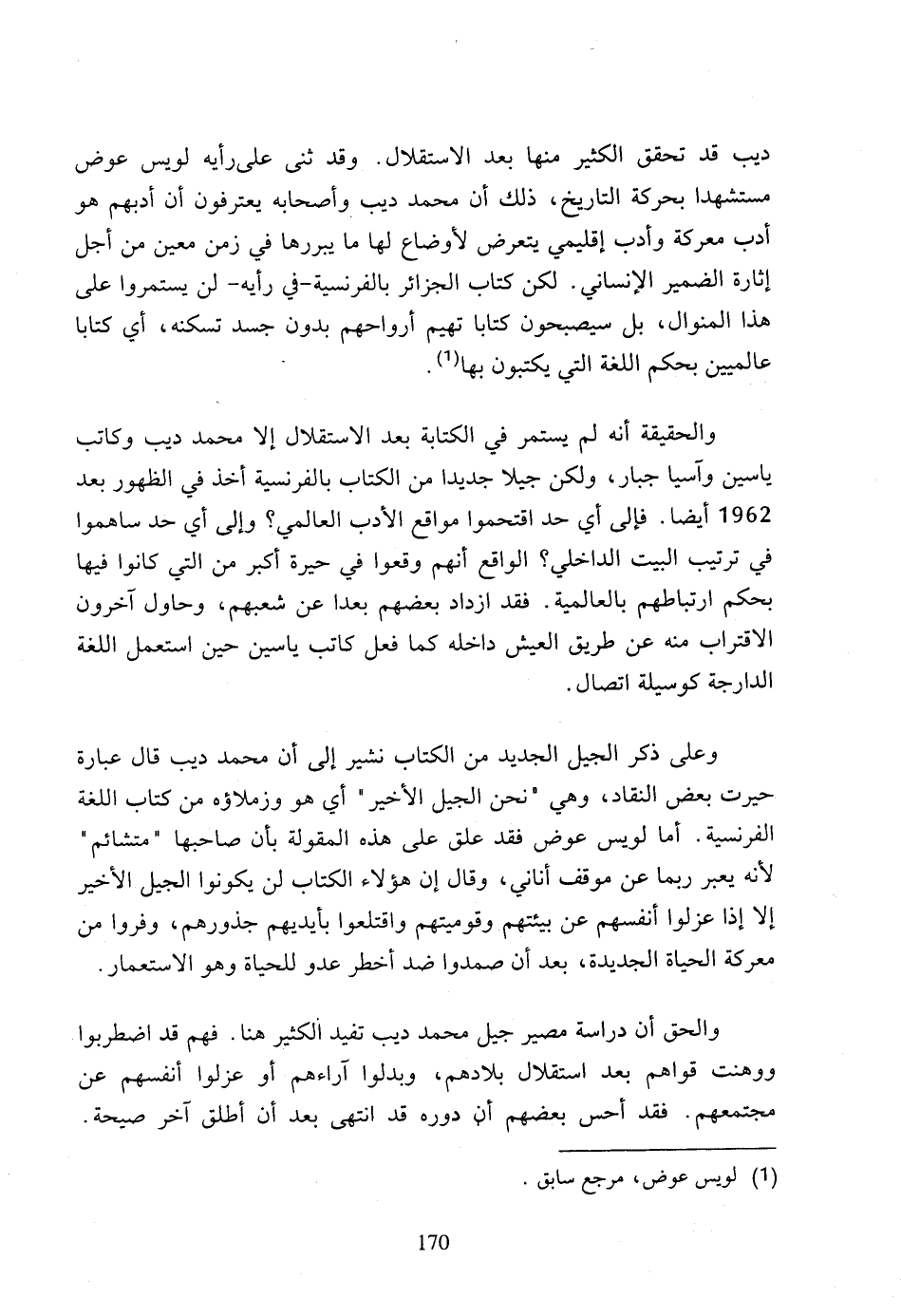 وعلى ذكر الجيل الجديد من الكتاب نشير إلى أن محمد ديب قال عبارة حيرت بعض النقاد، وهي (نحن الجيل الأخير) أي هو وزملاؤه من كتاب اللغة الفرنسية، أما لويس عوض فقد علق على هذه المقولة بأن صاحبها متشائم لأنه يعبر ربما عن موقف أناني، وقال إن هؤلاء الكتاب لن يكونوا الجيل الأخير إلا إذا عزلوا أنفسهم عن بيئتهم وقوميتهم واقتلعوا بأيديهم جذورهم، وفروا من معركة الحياة الجديدة، بعد أن صمدوا ضد أخطر عدو للحياة وهو الاستعمار.