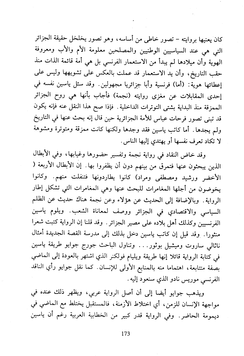 كان يعنيها بروايته - تصور خاطى من أساسه، وهو تصور يخلخل حقيقة الجزائر التي هي عند السياسيين الوطنيين والمصلحين معلومة الأم والأب ومعروفة الهوية وأن ميلادها لم يبدأ من الاستعمار الفرنسي بل هي أمة قائمة الذات منذ حقب التاريخ، وأن يد الاستعمار قد عملت بالعكس على تشويهها وليس على إعطائها هوية: (أما) فرنسية وأبا جزائريا مجهولين، وقد سئل ياسين نفسه في إحدى المقابلات عن مغزى روايته (نجمة) فأجاب بأنها هي روح الجزائر الممزقة منذ البداية بشتى التوترات الداخلية، فإذا صح هذا النقل عنه فإنه يكون قد تبنى تصور فرحات عباس للأمة الجزائرية حين قال إنه بحث عنها في التاريخ ولم يجدها، أما كاتب ياسين فقد وجدها ولكنها كانت ممزقة ومتوترة ومشوهة لا تكاد تعرف نفسها أو يهتدي إليها الناس.