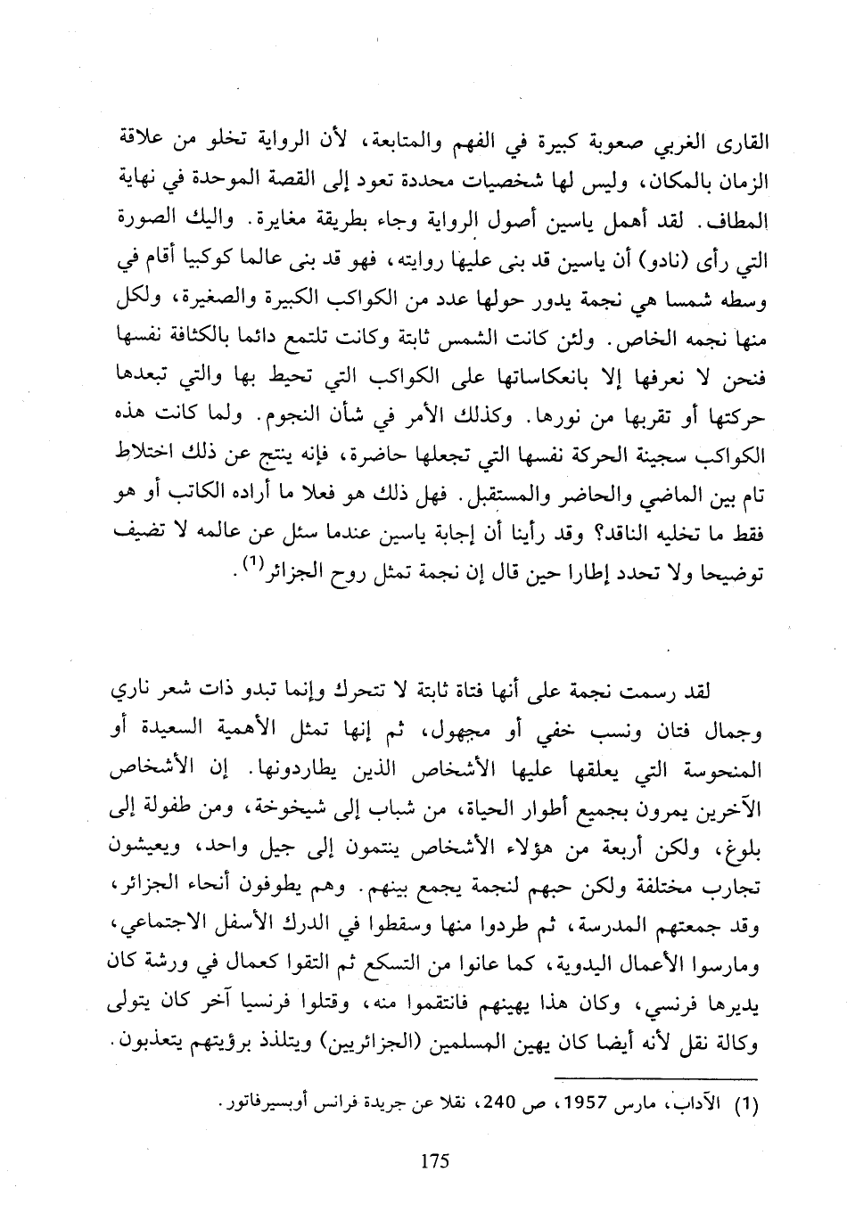 القارى الغربي صعوبة كبيرة في الفهم والمتابعة، لأن الرواية تخلو من علاقة الزمان بالمكان، وليس لها شخصيات محددة تعود إلى القصة الموحدة في نهاية المطاف، لقد أهمل ياسين أصول الرواية وجاء بطريقة مغايرة، وإليك الصورة التي رأى (نادو) أن ياسين قد بنى عليها روايته، فهو قد بنى عالما كوكبيا أقام في وسطه شمسا هي نجمة يدور حولها عدد من الكواكب الكبيرة والصغيرة، ولكل منها نجمه الخاص، ولئن كانت الشمس ثابتة وكانت تلتمع دائما بالكثافة نفسها فنحن لا نعرفها إلا بانعكاساتها على الكواكب التي تحيط بها والتي تبعدها حركتها أو تقربها من نورها، وكذلك الأمر في شأن النجوم، ولما كانت هذه الكواكب سجينة الحركة نفسها التي تجعلها حاضرة، فإنه ينتج عن ذلك اختلاط تام بين الماضي والحاضر والمستقبل، فهل ذلك هو فعلا ما أراده الكاتب أو هو فقط ما تخليه الناقد؟ وقد رأينا أن إجابة ياسين عندما سئل عن عالمه لا تضيف توضيحا ولا تحدد إطارا حين قال إن نجمة تمثل روح الجزائر (1).