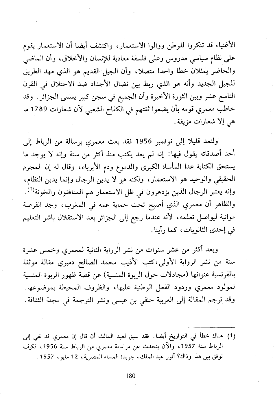 (1) هناك خطأ في التواريخ أيضا، فقد سبق لعبد المالك أن قال إن معمري قد نفي إلى الرباط سنة 1957، والآن يتحدث عن مراسلة معمري من الرباط سنة 1956، فكيف نوفق بين هذا وذاك؟ أنور عبد الملك، جريدة المساء المصرية، 12 مايو، 1957.