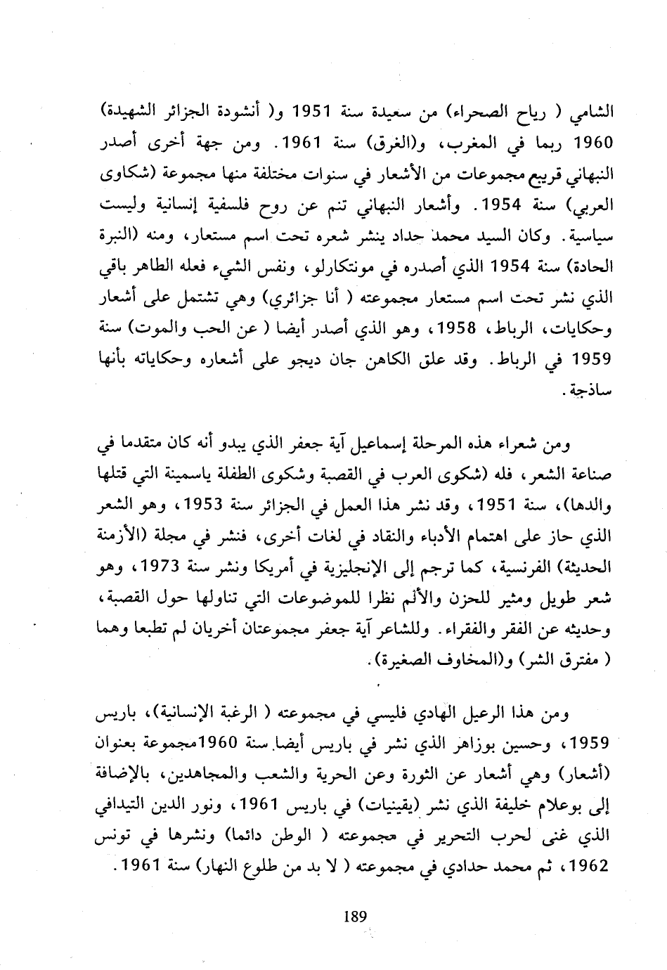 الشامي (رياح الصحراء) من سعيدة سنة 1951 و (أنشودة الجزائر الشهيدة) 1960 ربما في المغرب، و (الغرق) سنة 1961، ومن جهة أخرى أصدر النبهاني قريبع مجموعات من الأشعار في سنوات مختلفة منها مجموعة (شكاوى العربي) سنة 1954، وأشعار النبهاني تنم عن روح فلسفية إنسانية وليست سياسية، وكان السيد محمد حداد ينشر شعره تحت اسم مستعار، ومنه (النبرة الحادة) سنة 1954 الذي أصدره في مونتكارلو، ونفس الشيء فعله الطاهر باقي الذي نشر تحت اسم مستعار مجموعته (أنا جزائري) وهي تشتمل على أشعار وحكايات، الرباط، 1958، وهو الذي أصدر أيضا (عن الحب والموت) سنة 1959 في الرباط، وقد علق الكاهن جان ديجو على أشعاره وحكاياته بأنها ساذجة.