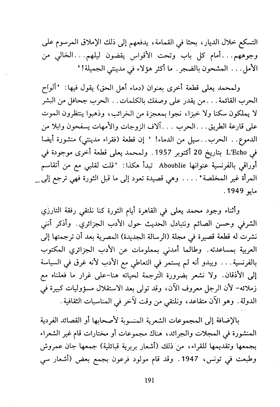 ولمحمد يعلى قطعة أخرى بعنوان (دماء أهل الحق) يقول فيها: (ألواح الحرب القائمة ... من يقدر على وصفك بالكلمات .. الحرب جحافل من البشر لا يملكون سكنا ولا خبزا، نجوا بمعجزة من الخراب، وذهبوا ينتظرون الموت على قارعة الطريق ... الحرب ... آلاف الزوجات والأمهات يسفحون وابلا من الدمع .. الحرب .. سيل من الدماء!) إن قطعة (فقراء مدينتي) منشورة أيضا في L'Echo بتاريخ 20 أكتوبر 1957، ولمحمد يعلى قطعة أخرى موجودة في أوراقي بالفرنسية عنوانها Aboublie تبدأ هكذا: (قلت لقلبي مع من أتقاسم المرأة غير المخلصة) .... وهي قصيدة تعود إلى ما قبل الثورة فهي ترجع إلى مايو 1949.