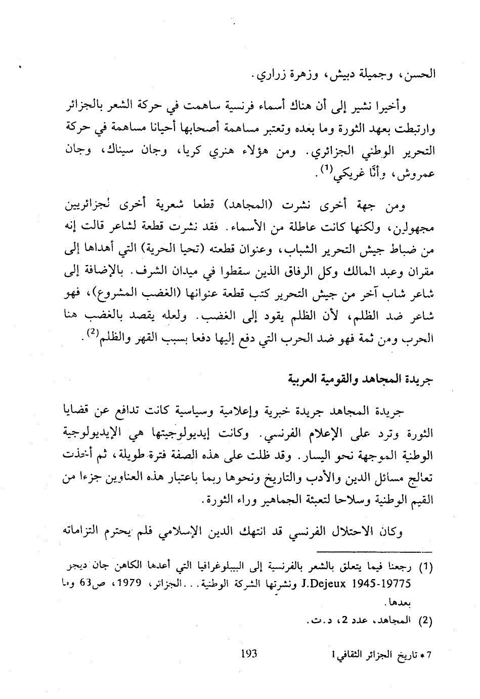 (1) رجعنا فيما يتعلق بالشعر بالفرنسية إلى البيبلوغرافيا التي أعدها الكاهن جان ديجو 19775 - 1945 J. Dejeux ونشرتها الشركة الوطنية ... الجزائر، 1979، ص 63 وما بعدها.