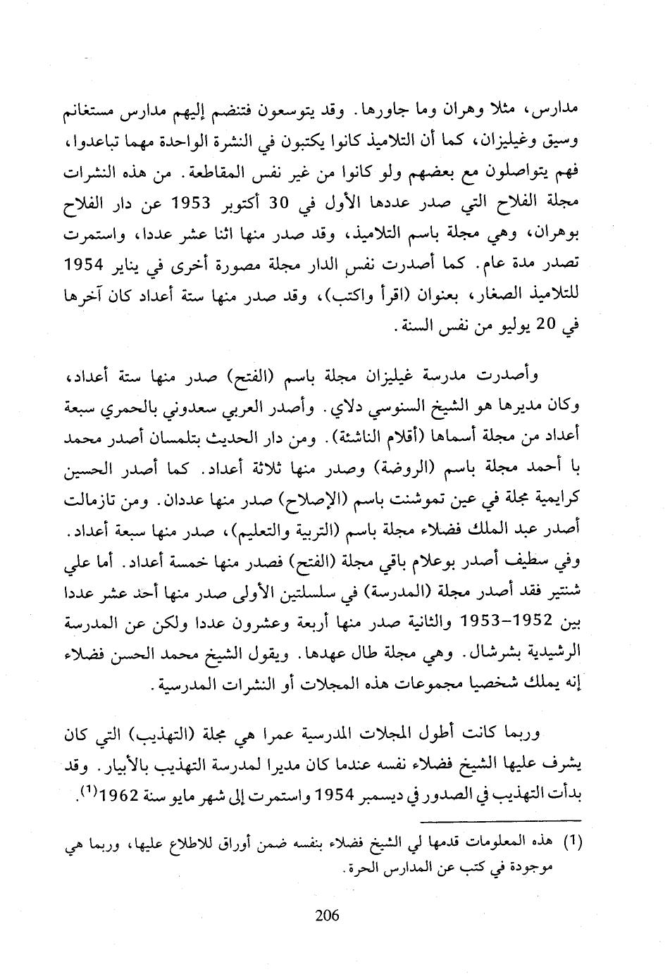 مدارس، مثلا وهران وما جاورها، وقد يتوسعون فتنضم إليهم مدارس مستغانم وسيق وغيليزان، كما أن التلاميذ كانوا يكتبون في النشرة الواحدة مهما تباعدوا، فهم يتواصلون مع بعضهم ولو كانوا من غير نفس المقاطعة، من هذه النشرات مجلة الفلاح التي صدر عددها الأول في 30 أكتور 1953 عن دار الفلاح بوهران، وهي مجلة باسم التلاميذ، وقد صدر منها اثنا عشر عددا، واستمرت تصدر مدة عام، كما أصدرت نفس الدار مجلة مصورة أخرى في يناير 1954 للتلاميذ الصغار، بعنوان (اقرأ واكتب)، وقد صدر منها سنة أعداد كان آخرها في 20 يوليو من نفس السنة.