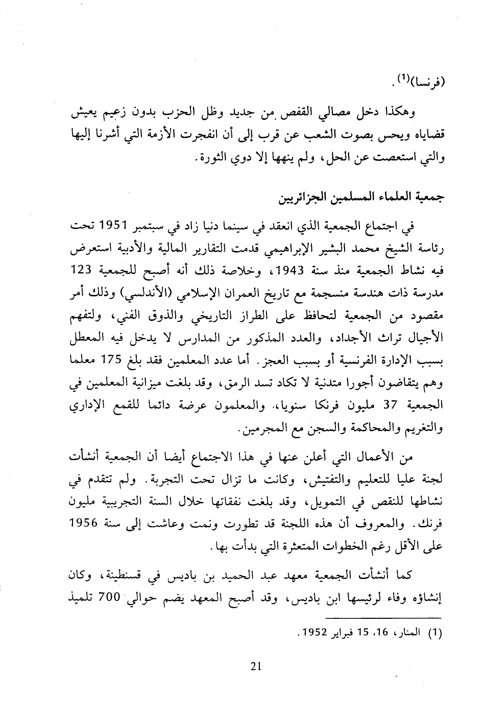 في اجتماع الجمعية الذي انعقد في سينما دنيا زاد في سبتمبر 1951 تحت رئاسة الشيخ محمد البشير الإبراهيمي قدمت التقارير المالية والأدبية استعرض فيه نشاط الجمعية منذ سنة 1943، وخلاصة ذلك أنه أصبح للجمعية 123 مدرسة ذات هندسة منسجمة مع تاريخ العمران الإسلامي (الأندلسي) وذلك أمر مقصود من الجمعية لتحافظ على الطراز التاريخي والذوق الفني، ولتفهم الأجيال تراث الأجداد، والعدد المذكور من المدارس لا يدخل فيه المعطل بسبب الإدارة الفرنسية أو بسبب العجز، أما عدد المعلمين فقد بلغ 175 معلما وهم يتقاضون أجورا متدنية لا تكاد تسد الرمق، وقد بلغت ميزانية المعلمين في الجمعية 37 مليون فرنكا سنويا، والمعلمون عرضة دائما للقمع الإداري والتغريم والمحاكمة والسجن مع المجرمين.